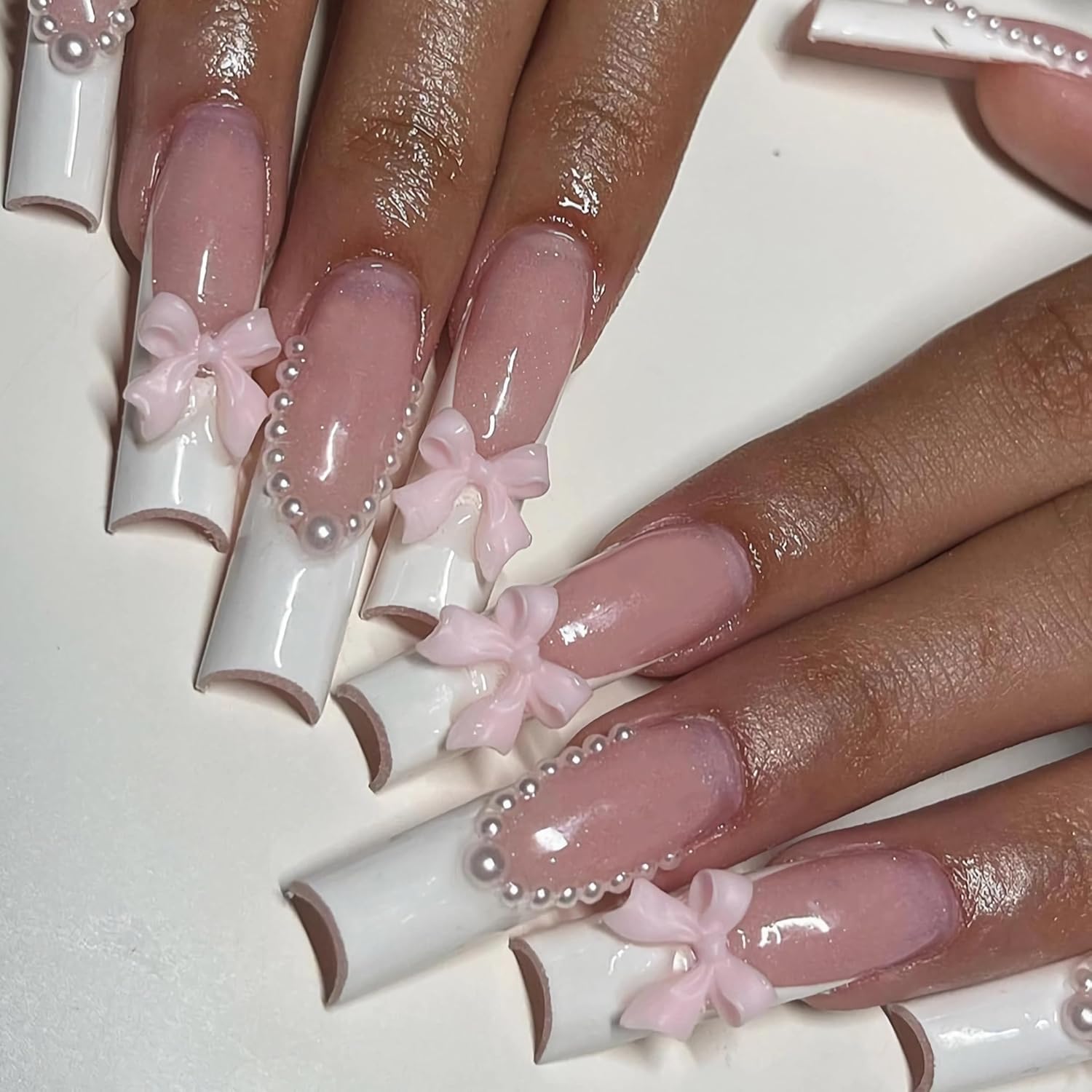BABALAL Uñas postizas largas cuadradas a presión, uñas postizas blancas con punta francesa, uñas con pegamento en 3D, uñas acrílicas con dije de arco 3D, 24 unidades, uñas postizas cuadradas