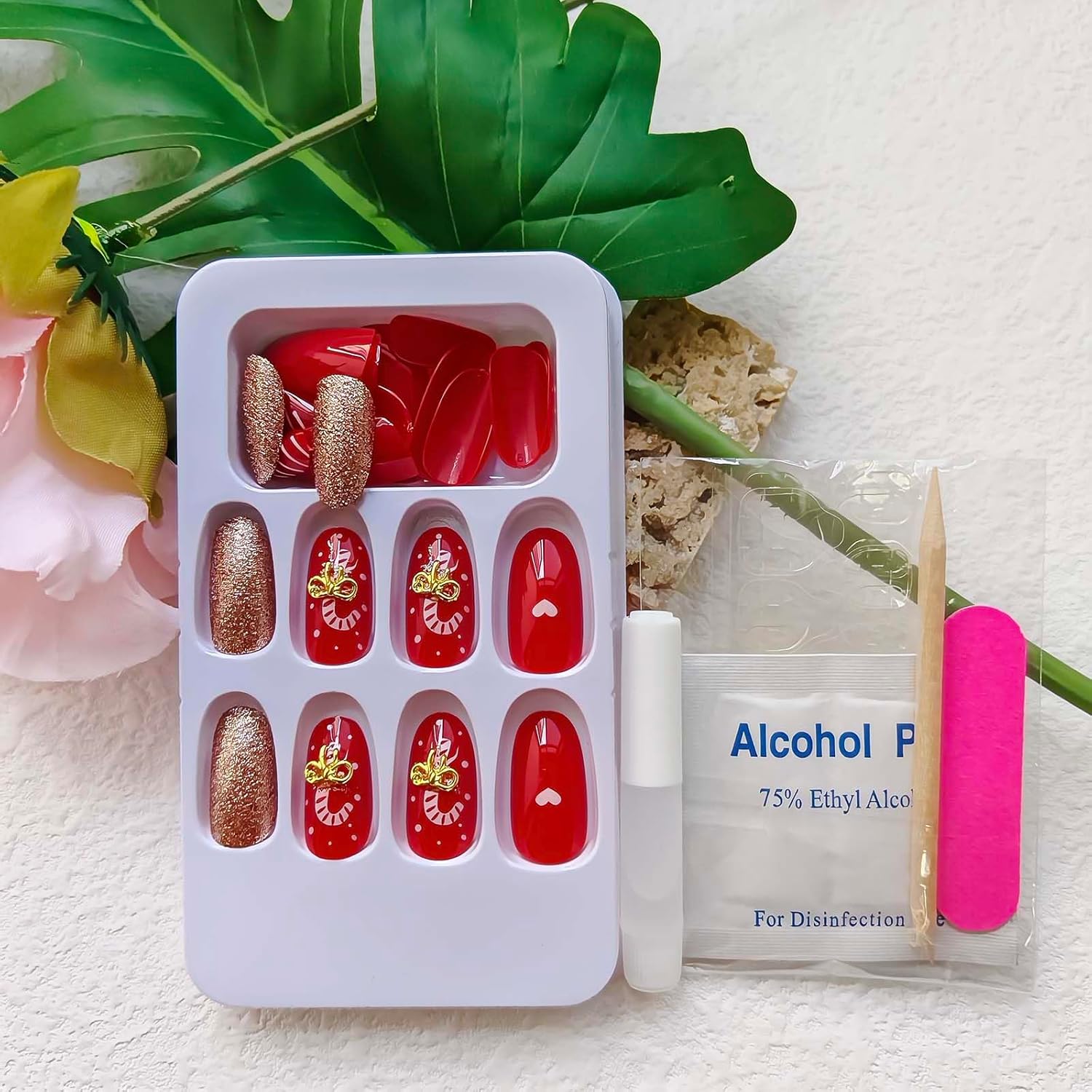 BUñas postizas a presión de Navidad, uñas postizas medianas de almendra, uñas postizas acrílicas con lazo dorado 3D y diseños de purpurina, uñas artificiales brillantes de cobertura completa,A22  ovaladas,