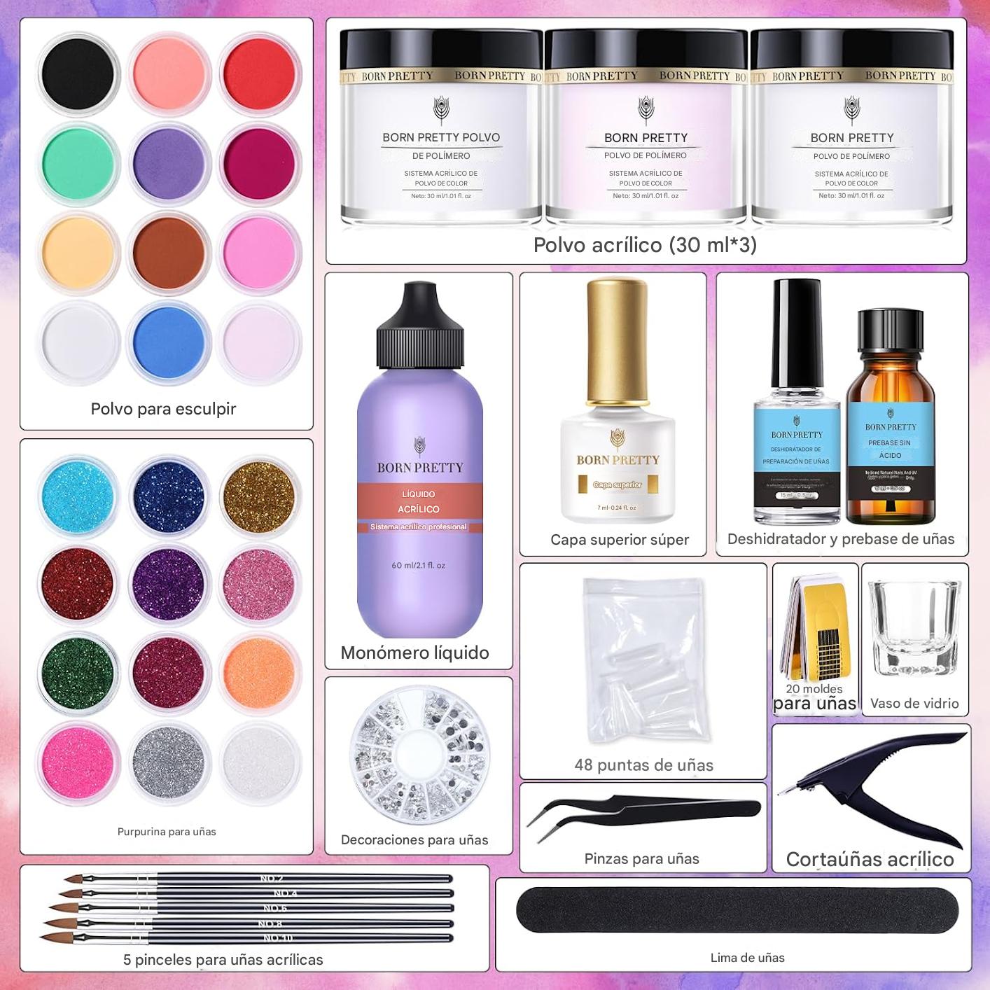 - Kit de uñas acrílicas para principiantes: kit de uñas acrílicas todo en uno con todo. Viene con 3 cajas de polvo acrílico de 1.0 fl oz, monómero líquido acrílico de 2.0 fl oz, súper capa superior, deshidratador de preparación de uñas y imprimación de uñas, pegamento de uñas, 48 puntas de uñas, 20 piezas de forma de uñas, vaso de vidrio de uñas, pinzas de uñas, cortaúñas acrílicas, lima de uñas, decoraciones de uñas, 5 piezas acrílicas Brush,12 Cajas de purpurina de uñas, 12 cajas de polvo para tallar. Este kit de uñas acrílicas te permite crear fácilmente una extensión de uñas acrílicas fuerte, flexible y hermosa.