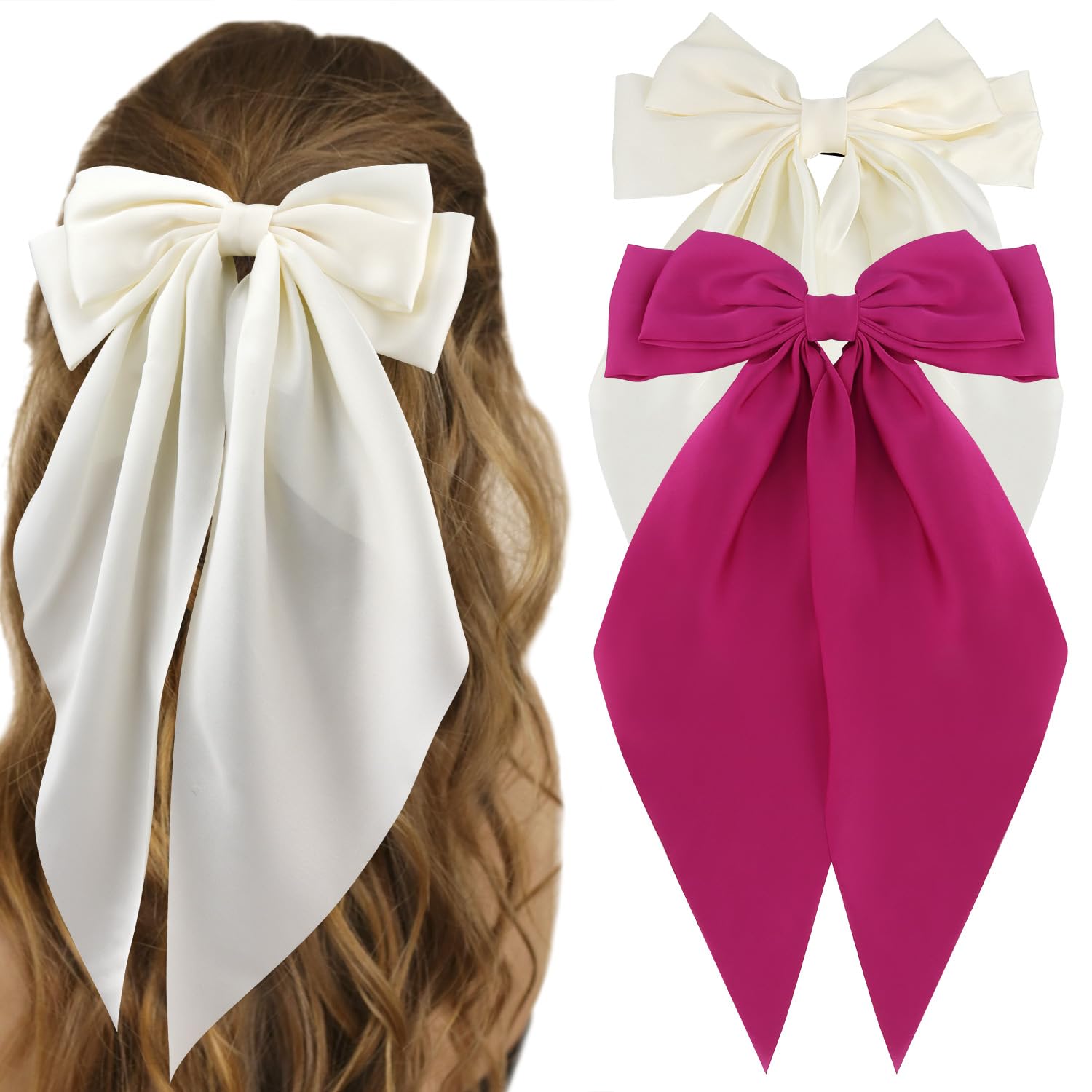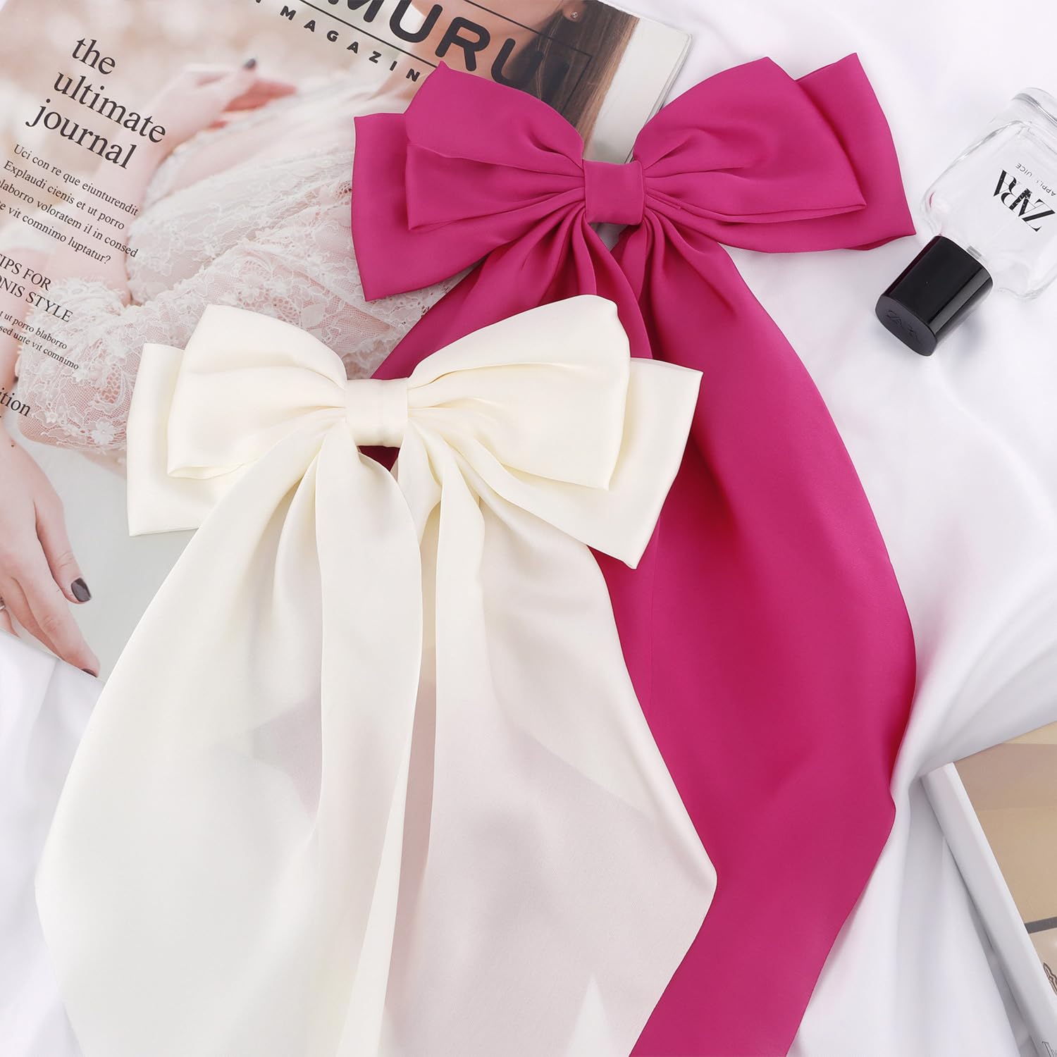 Lazos de satén sedoso para el cabello, 2 unidades, color beige y rosa intenso, lazos grandes para el cabello para mujeres, pinzas de cola larga de gran tamaño, cintas para el cabello, pasadores