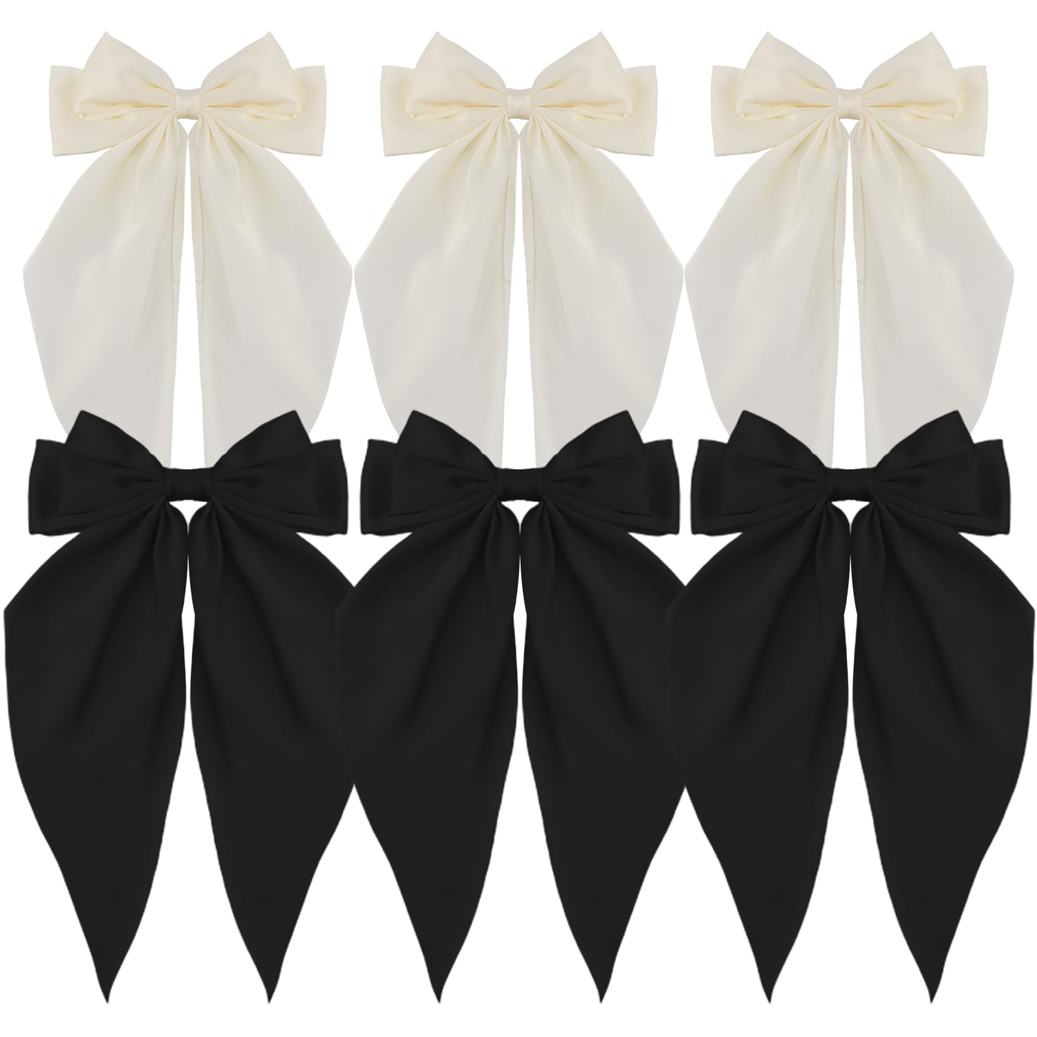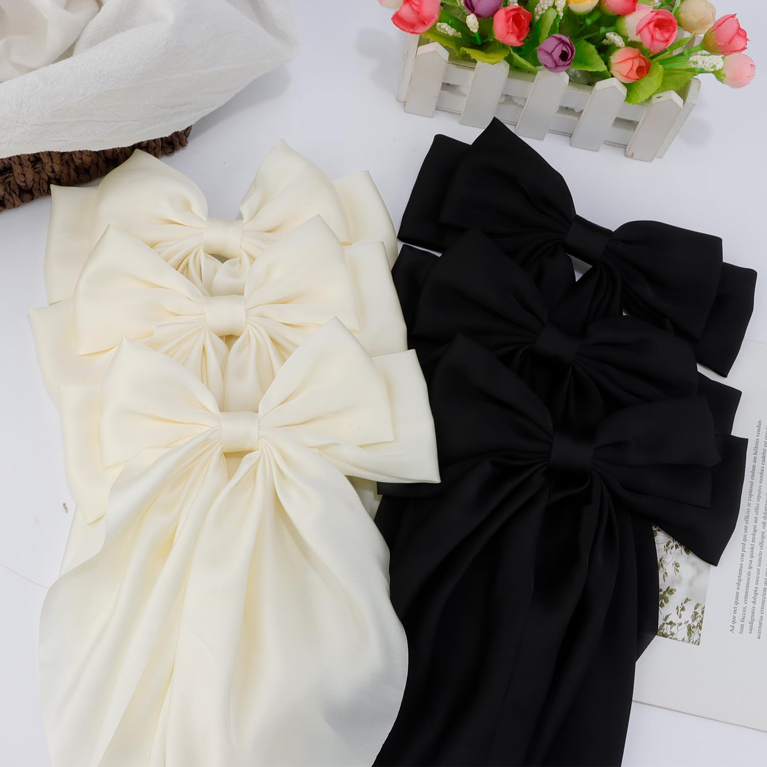 Pasadores de pelo de gran tamaño: clips de lazo de satén sedoso, cintas de cola larga para mujer, negro, blanco, beige (6 unidades)