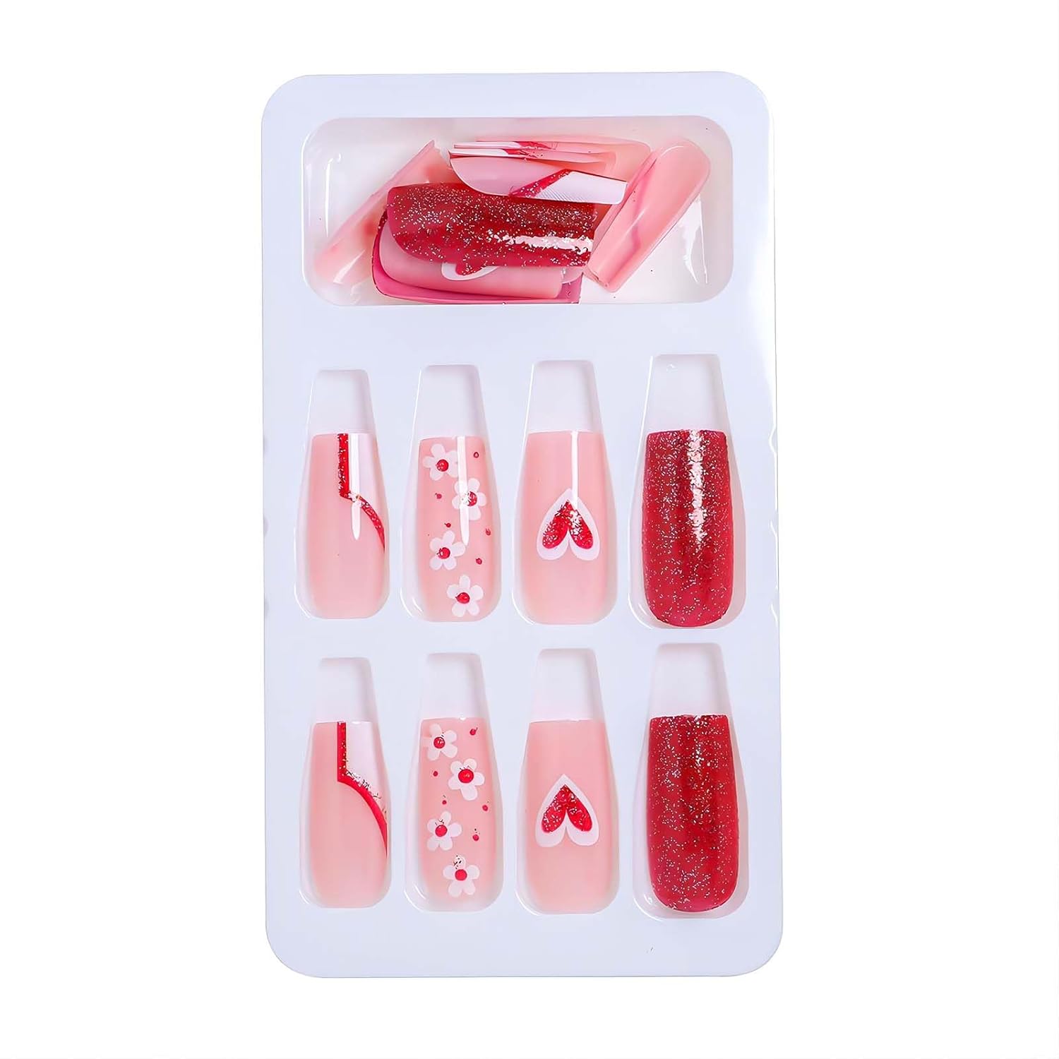 Uñas postizas a presión de corazón de San Valentín, uñas postizas cuadradas medianas, uñas postizas acrílicas rosas con diseños de flores y purpurina, uñas ar