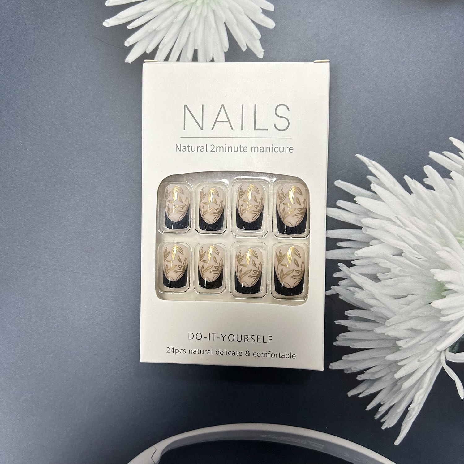 Uñas postizas a presión de longitud media, uñas postizas francesas negras con diseño de hojas doradas, uñas postizas acrílicas artificiales, uñas cuadradas, cobertura completa, brillantes