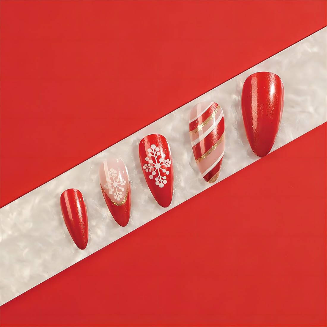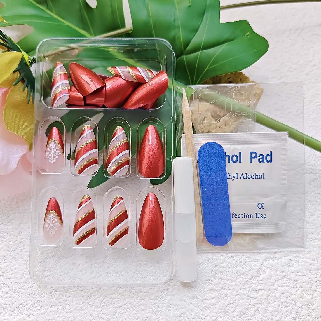 Uñas postizas a presión de Navidad, punta francesa, almendra roja, uñas postizas con pegamento, uñas postizas acrílicas con purpurina y diseños de copos de