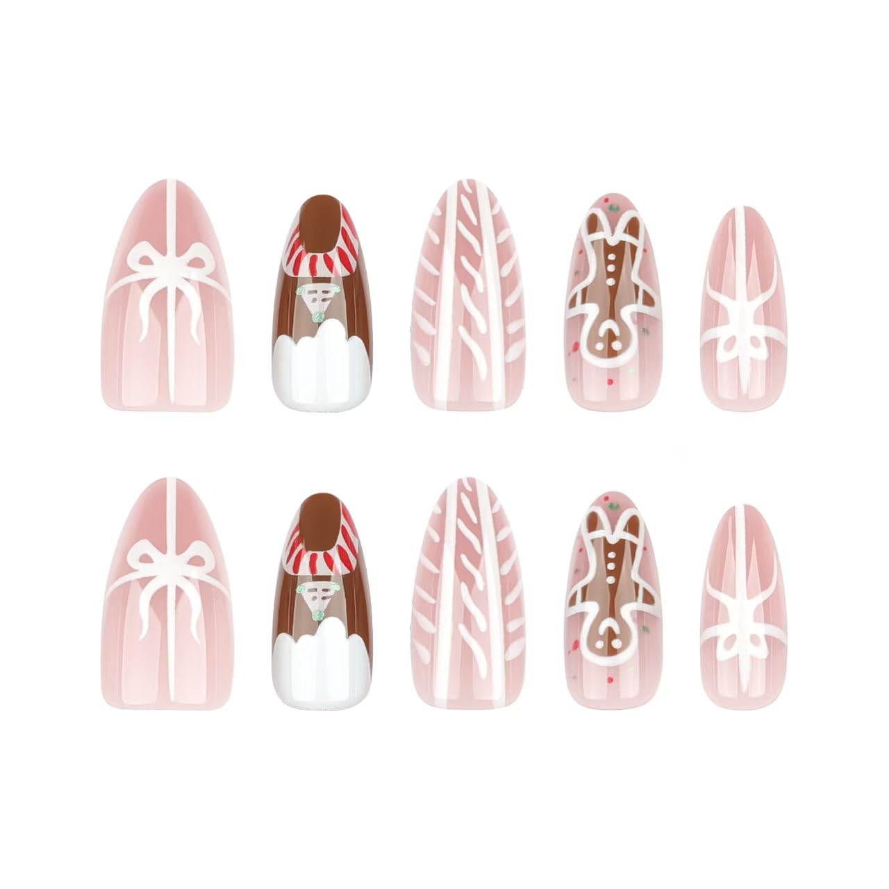 Uñas postizas a presión de Navidad, uñas postizas cortas de almendra, muñeco de nieve, uñas postizas brillantes con diseño de caramelo, uñas con pegamento nude, uñas acrílicas artificiales con lazo,