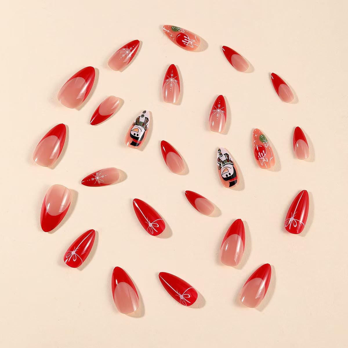Uñas postizas a presión de Navidad, uñas postizas medianas de almendra, uñas postizas de punta francesa roja con diseño de copo de nieve, A22 pegamento con purpurina, uñas acrílicas artificiales, muñeco