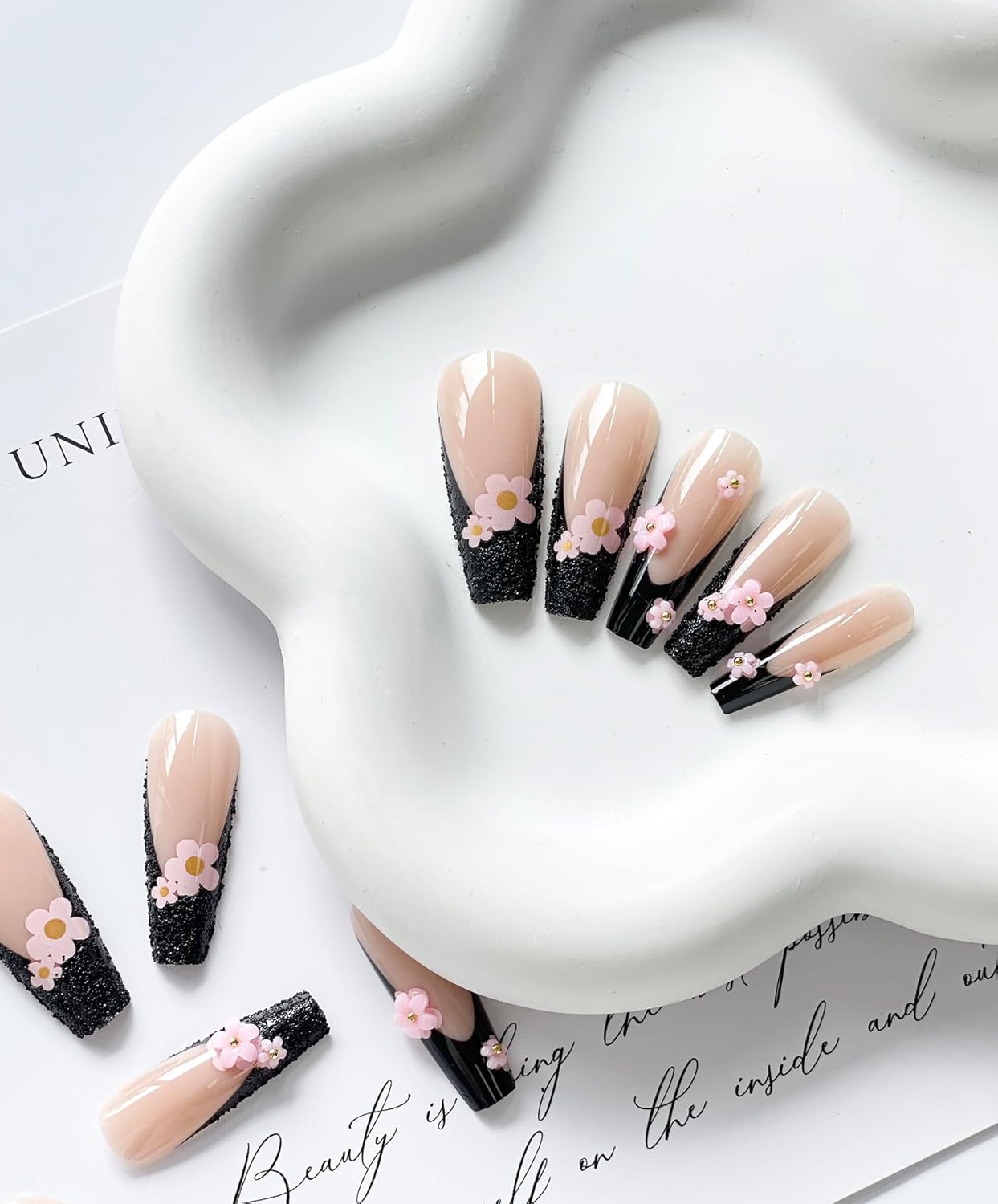Uñas postizas largas con punta francesa negra tipo ataúd MABKJLF de cobertura completa con diseños de flores rosas 5D, uñas postizas brillantes con pegamento para uñas, uñas artificiales para mujeres