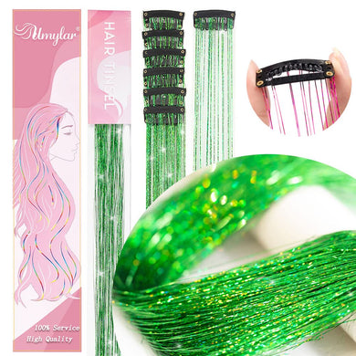 Paquete de 12 extensiones de cabello de oropel con clip de 20 pulgadas con clip, color verde brillantina, a21 para festivales,