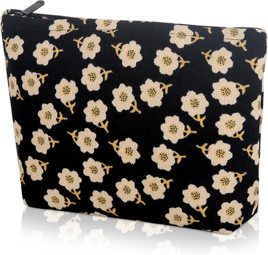 Bolsa de cosméticos Bolsa de maquillaje Preppy Cute Corduroy Neceser para mujeres esenciales de viaje a22 negro (Flower Black), Cara de moda