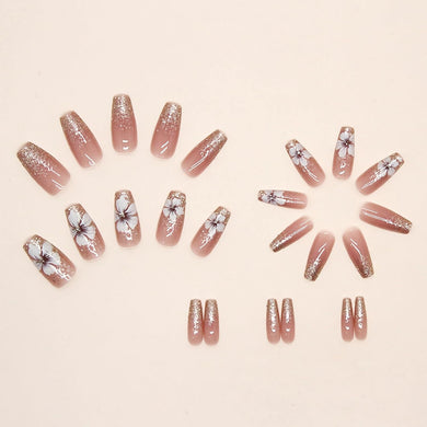 Uñas postizas largas cuadradas a presión, uñas postizas con pegamento de flores, punta francesa, uñas acrílicas coquetas, 24 unidades, a22 cobertura completa