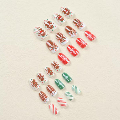 Uñas postizas a presión de Navidad, uñas postizas medianas de almendra, de hombre de jengibre, con diseño de rayas, con pegamento de copo de nieve, A22 uñas acrílicas artificiales rojas y verdes