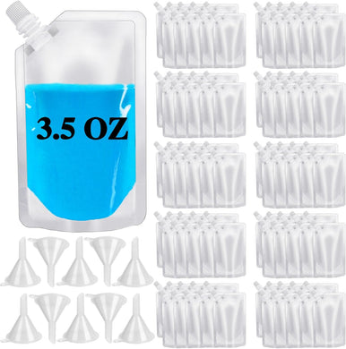 100 bolsas de plástico desechables a granel, bolsas transparentes para jugos, salsa, a prueba de fugas, con embudo, para adultos, viajes, deportes al aire libre, conciertos (10 onzas)