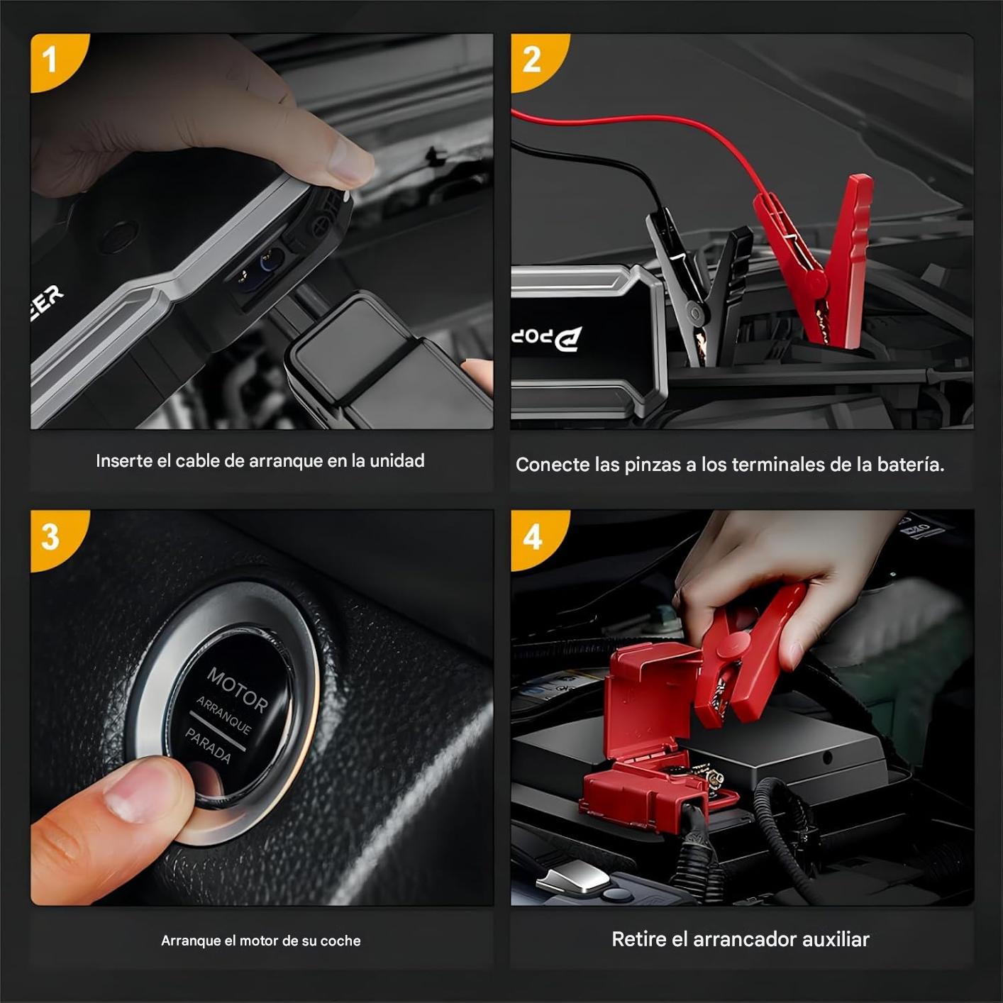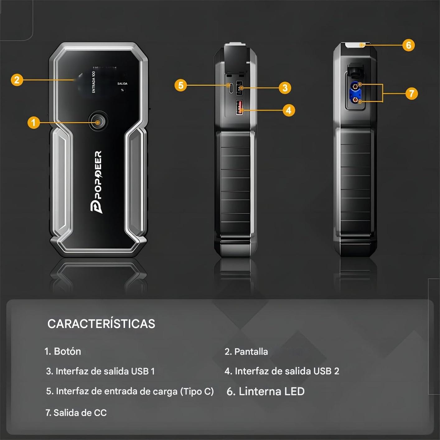 - Fuerte arranque del motor] El arrancador de coche POPDEER PD-J01 puede arrancar fácilmente una batería agotada. La caja de salto ofrece una corriente máxima de hasta 2500 A, este paquete de baterías de arranque portátil puede arrancar rápidamente una batería de automóvil de hasta 8.0 L de gasolina o motores diésel de 6.0 L en segundos, adecuado para todos los automóviles, camiones, motocicletas, motos de nieve, SUV, cortacésped, yates, etc.