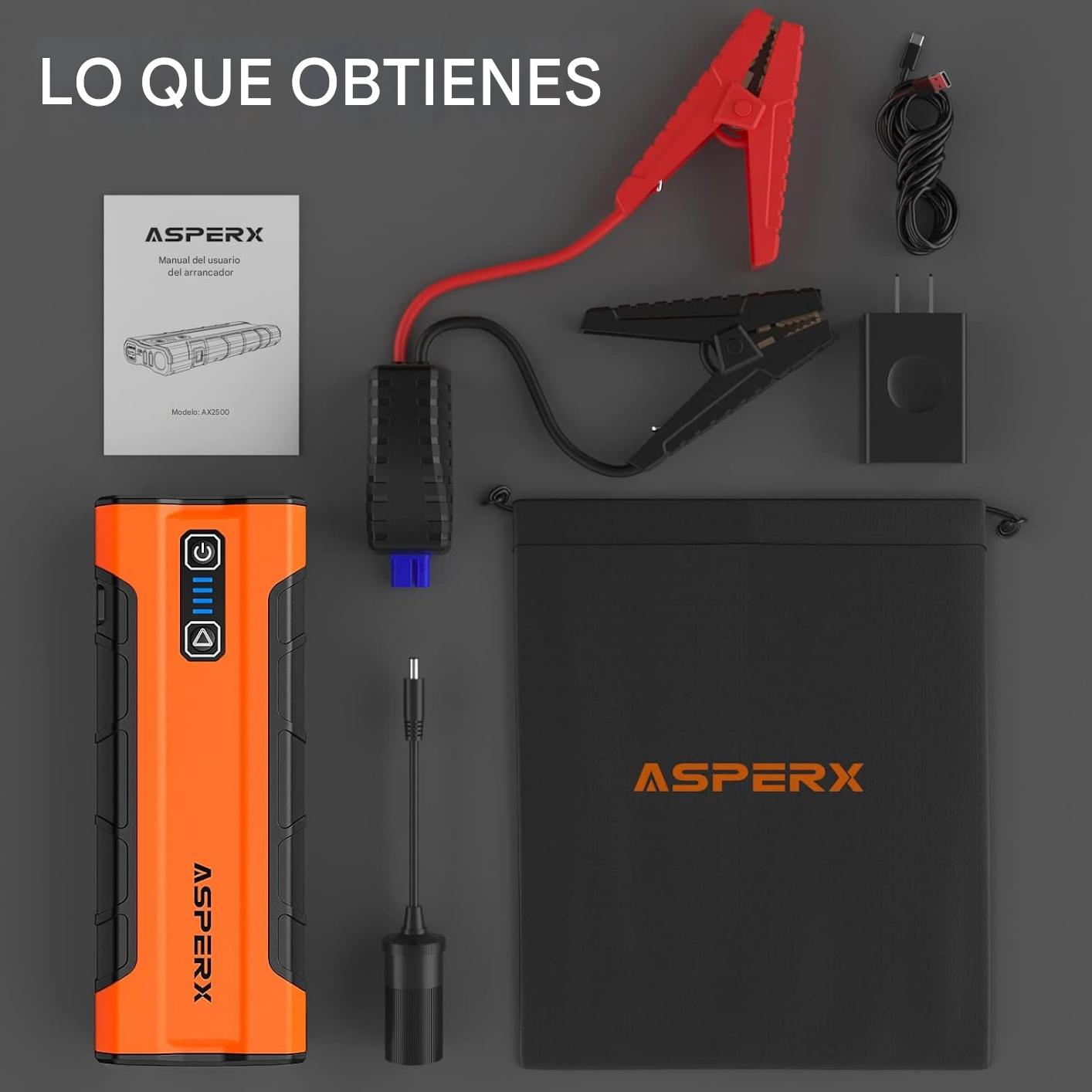 • 【Lo que obtienes】: ASPERX AX2500 Arrancador de salto de coche portátil x1, Cable de salto inteligente x1, Cargador de pared 5V / 3.0A x1, Cable de carga USB tipo C x1, Estuche de almacenamiento x1, Adaptador de encendedor de cigarrillos x1, Manual de usuario x1. Soporte técnico de 2 años. Si tiene alguna pregunta postventa sobre el puente de batería, no dude en contactarnos.