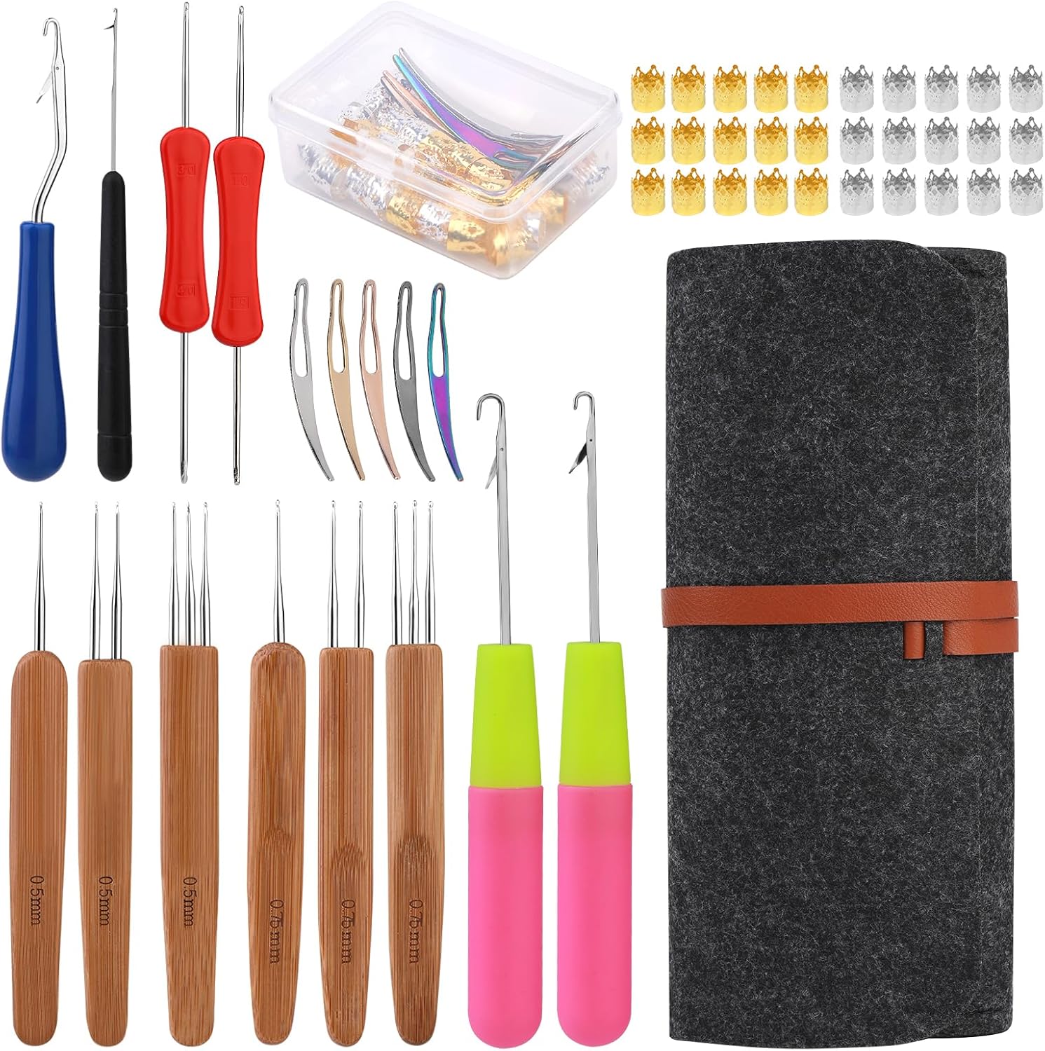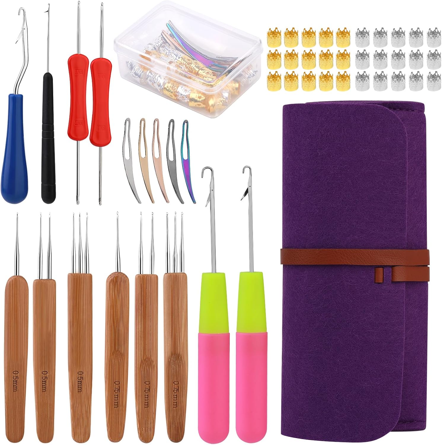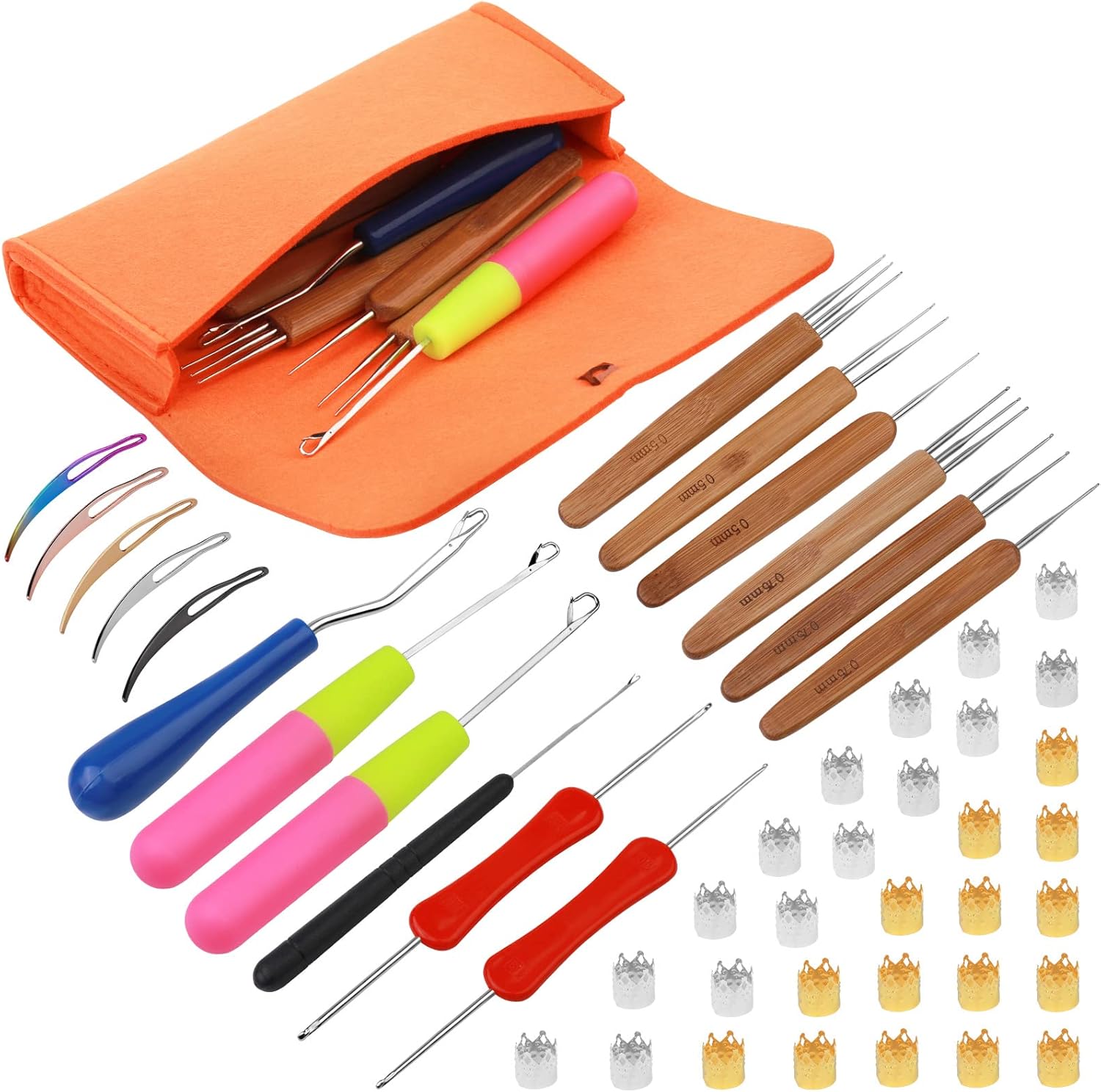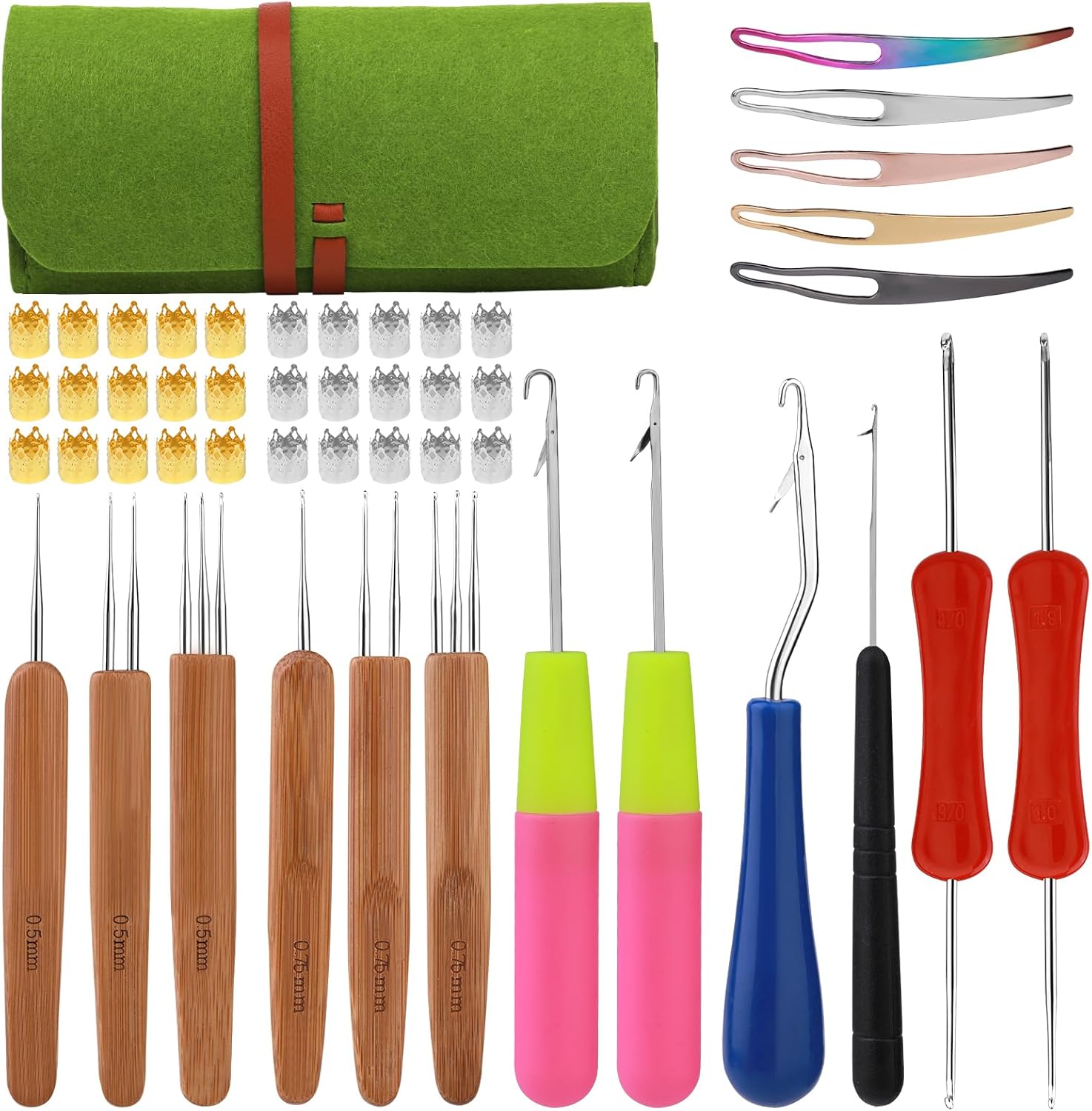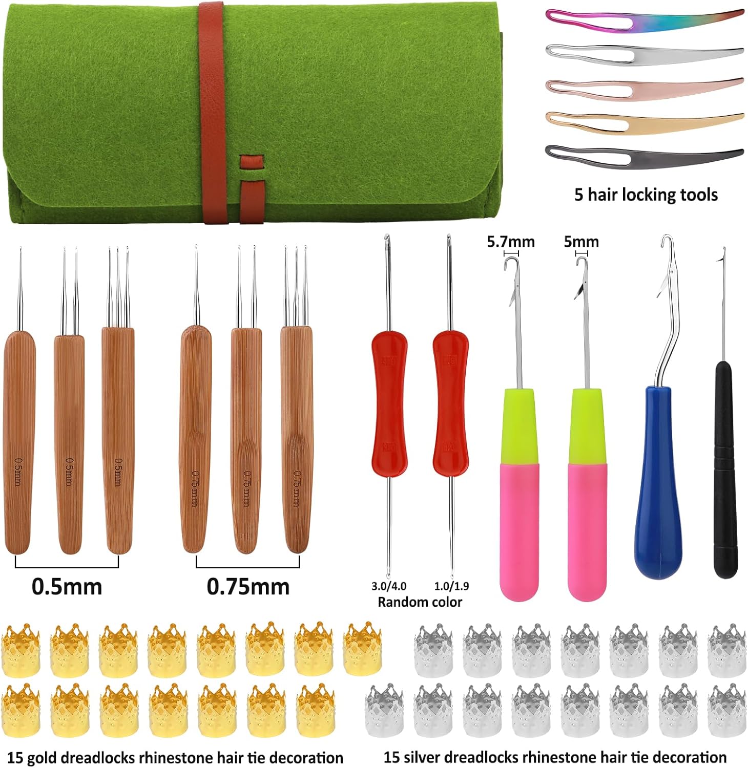 - Obtendrás: este juego de ganchos de ganchillo para cabello incluye 6 piezas de herramientas de dreadlocks de mango de bambú de 0.75 y 0.020 in, 1 gancho de plástico grande y 1 gancho de plástico pequeño, 1 gancho de pestillo doblado con mango azul, 1 gancho de pestillo de mango negro, 2 ganchos de ganchillo de doble extremo, 30 piezas decoración de lazos de pelo con diamantes de imitación, 5 piezas herramientas de bloqueo de cabello. Este juego completo de herramientas viene en una bolsa de almacenamiento verde.