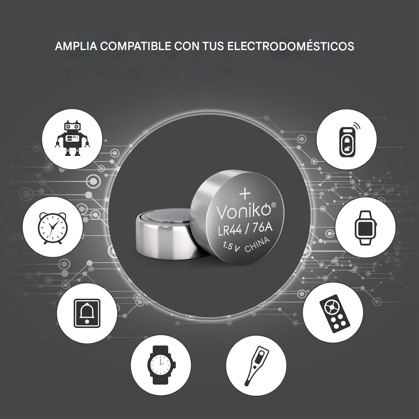 - Funciona con muchos dispositivos pequeños: baterías LR44 que puedes utilizar con tus juguetes, timbre inalámbrico, calculadoras, relojes, mini radios, mini linternas, controladores de juegos y otros dispositivos digitales.