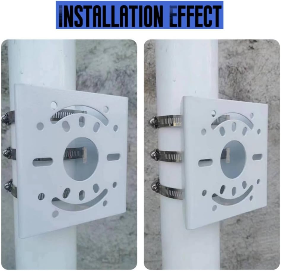 - Fija tu cámara en el adaptador de montaje en poste vertical, coloca los bucles de acero inoxidable a través de los agujeros en la parte posterior del soporte, átala al poste vertical u horizontal, y luego aprieta los tornillos al tamaño correcto. Es adecuado para montaje en interiores, exteriores, superior, pared y techo.
