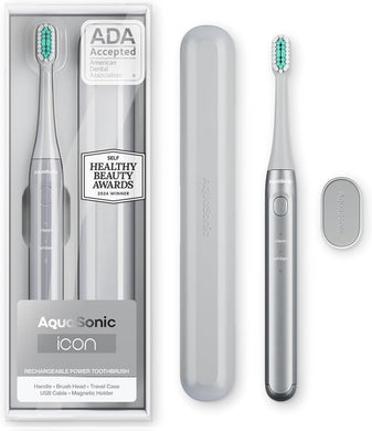 Aquasonic Icon - Cepillo de dientes recargable aceptado por la ADA, soporte magnético y estuche de viaje delgado, 2 modos de ln23 cepillado y temporizadores inteligentes, microvibraciones suaves (piedra)