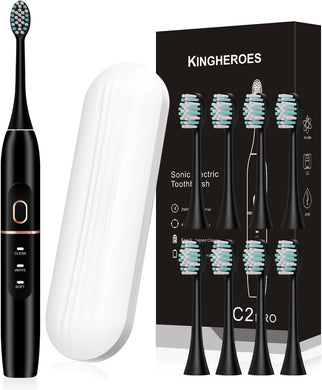 Cepillo de dientes eléctrico Sonic con 8 cabezales de cepillo y funda de viaje, 4 modos, una carga que dura 60 días, ln23 motor 42000 VPM, juego de cepillos de dientes eléctricos negros