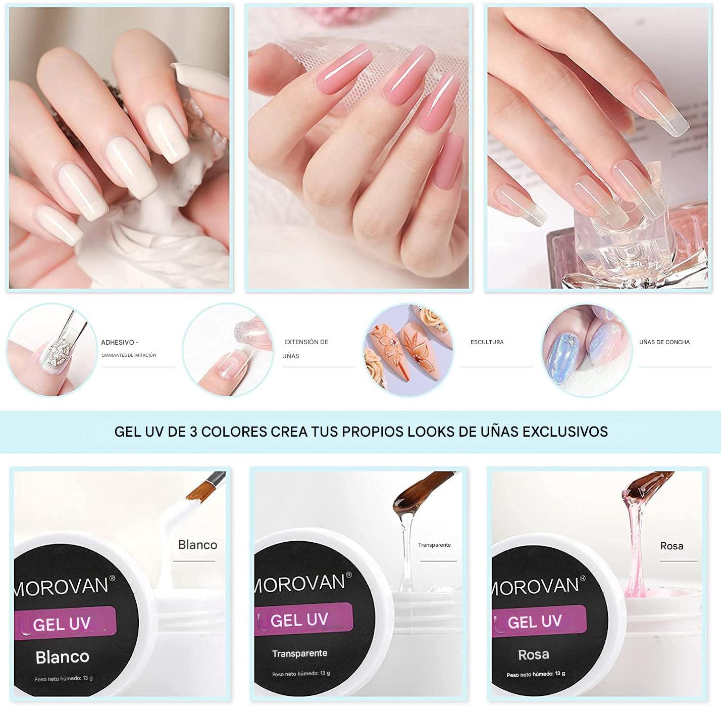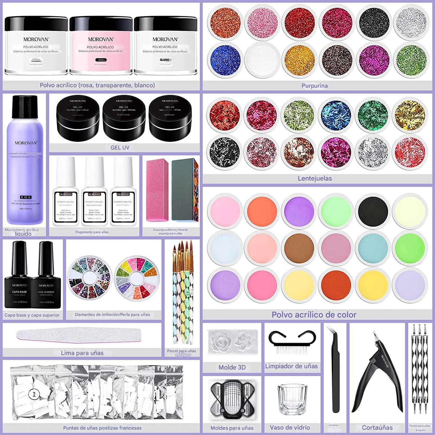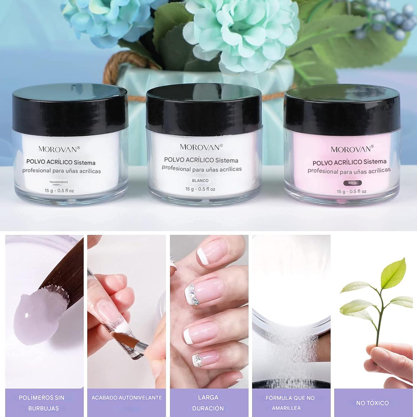 1 x capa base, 1 x capa superior, 3 x gel UV (transparente, rosa, blanco), 3 x polvo acrílico (transparente, rosa, blanco, 0.53 oz), 5 x cepillo acrílico, 3 x pluma punteadora de uñas.