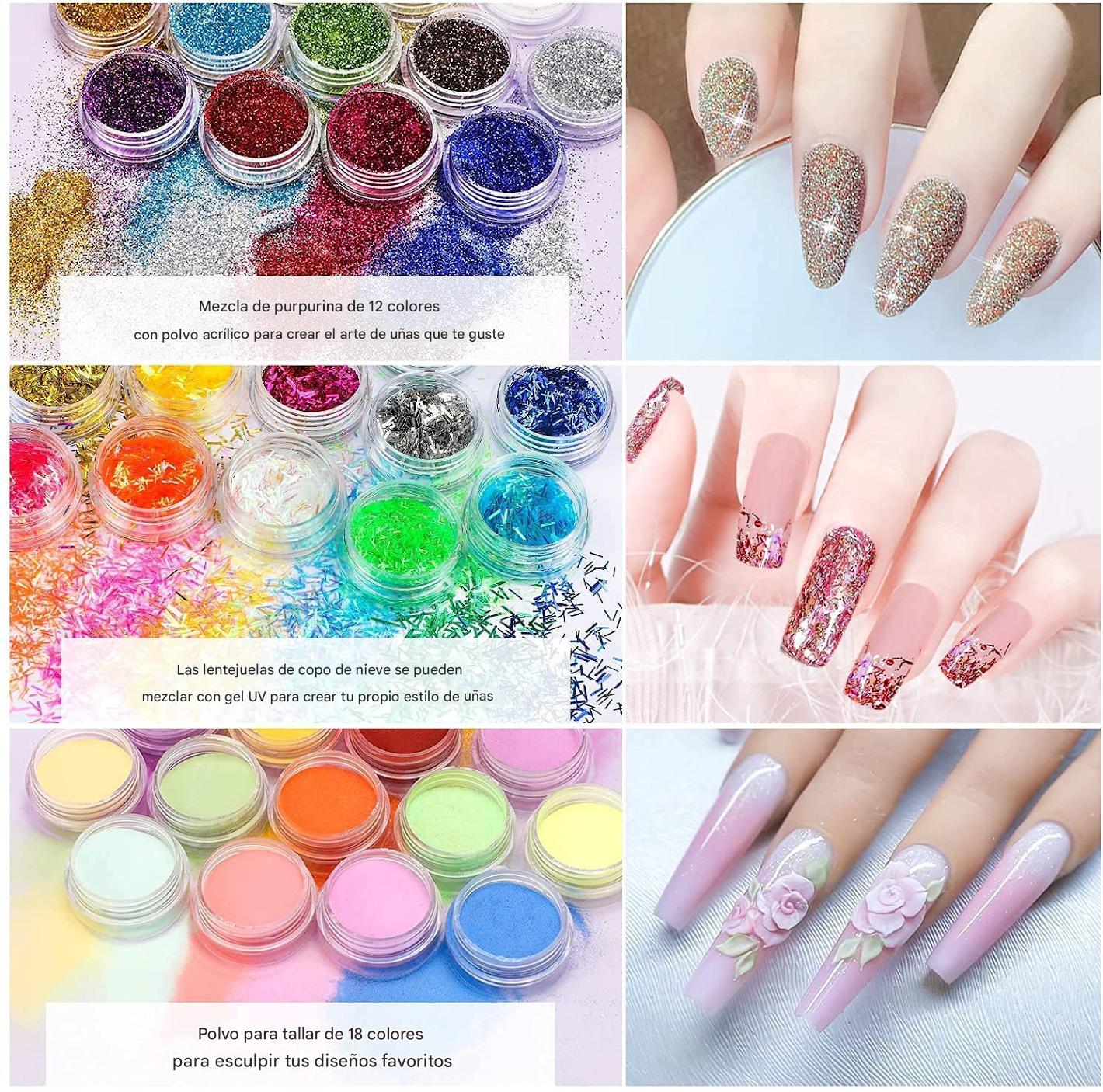 18 colores en polvo acrílico caries (0.04 oz), 12 lentejuelas (0.04 oz), 12 x purpurina (0.04 oz), 1 x bloque de búfer de 4 vías, 1 x bloque de búfer