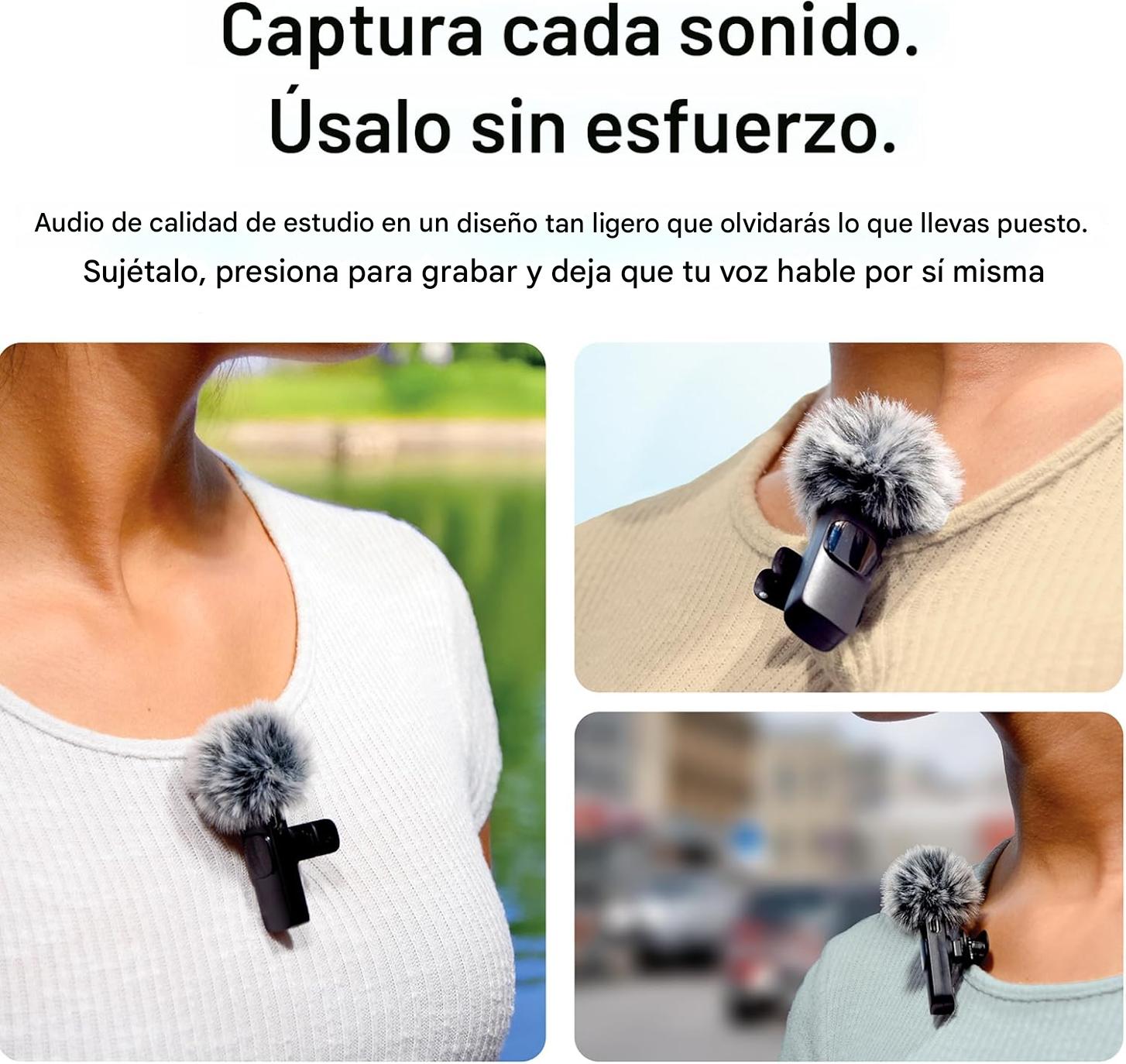 - Sonido profesional, en cualquier lugar: desde voces en off hasta entrevistas virales, Mini Mic Pro captura audio nítido y corta el ruido de fondo, incluso al aire libre, gracias a la protección contra el viento incluida como espuma de alta densidad y una cubierta de gato muerto.