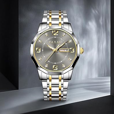 - Diseño de moda de lujo: reloj Taxau para hombre con esfera gris con diamantes y números arábigos dorados, tanto de estilo vintage como detalles de reloj de lujo. La correa de reloj de acero inoxidable es cómoda de llevar. Después de que el reloj esté iluminado por una luz fuerte durante más de 30 segundos, el puntero puede activar la función de luz nocturna, lo que te permite ver la hora claramente incluso por la noche. El reloj Taxau para hombre también tiene una ventana de fecha, lo que aumenta su practicidad.