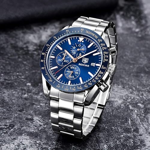 Diseño elegante: BENYAR ofrece a los hombres una gama de relojes de diseño clásico. Este reloj viene con cristal 100% grueso y una caja de plata pulida. La esfera redonda azul de este reloj cuenta con una esfera multifuncional, un cronógrafo y un indicador de día para un aspecto elegante.