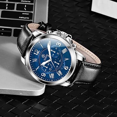 • Reloj de pulsera con cronógrafo para hombre: el reloj clásico para hombre tiene dos sub-esferas, incluyendo minutos y segundos de cronógrafo para satisfacer tu uso diario. La correa de cuero para hombre con esfera azul tiene un movimiento de cuarzo de alta calidad integrado y una batería para garantizar un cronometraje