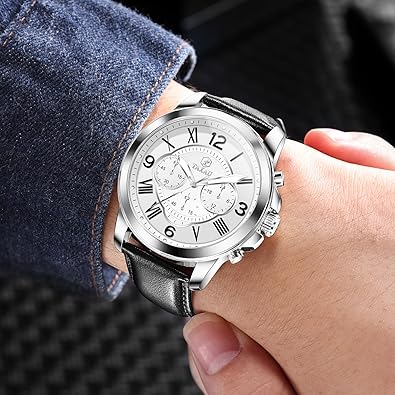 Reloj de cuero negro para hombre: los relojes de vestir de negocios para hombre están diseñados con una cara grande blanca clásica de lujo, espejo de cristal de alta dureza transparente resistente a los arañazos y grandes números arábigos y números romanos para leer la hora fácilmente y la correa de cuero suave negra ajustable es muy cómoda de llevar.