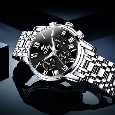 - Diseño lujoso y elegante: este reloj para hombre está equipado con una esfera de cronógrafo negra, una práctica ventana de visualización de fecha y manecillas luminosas. La elegante curva del cuerpo del reloj muestra el estilo