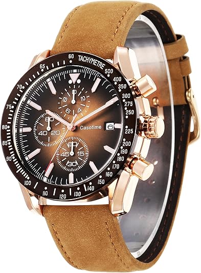- Relojes de cuero para hombre: los relojes Casotime están diseñados con atención al detalle y la estética. Con esfera de cronógrafo, caja redonda reconocible de 1.772 in, una ventana de visualización de fecha siempre práctica, 6 manecillas e índices clásicos fáciles de leer, correa de cuero de 9.449 in. Movimiento de cuarzo importado, la duración de la batería disponible durante al menos 2 años. Un reloj indispensable para cualquier ocasión.