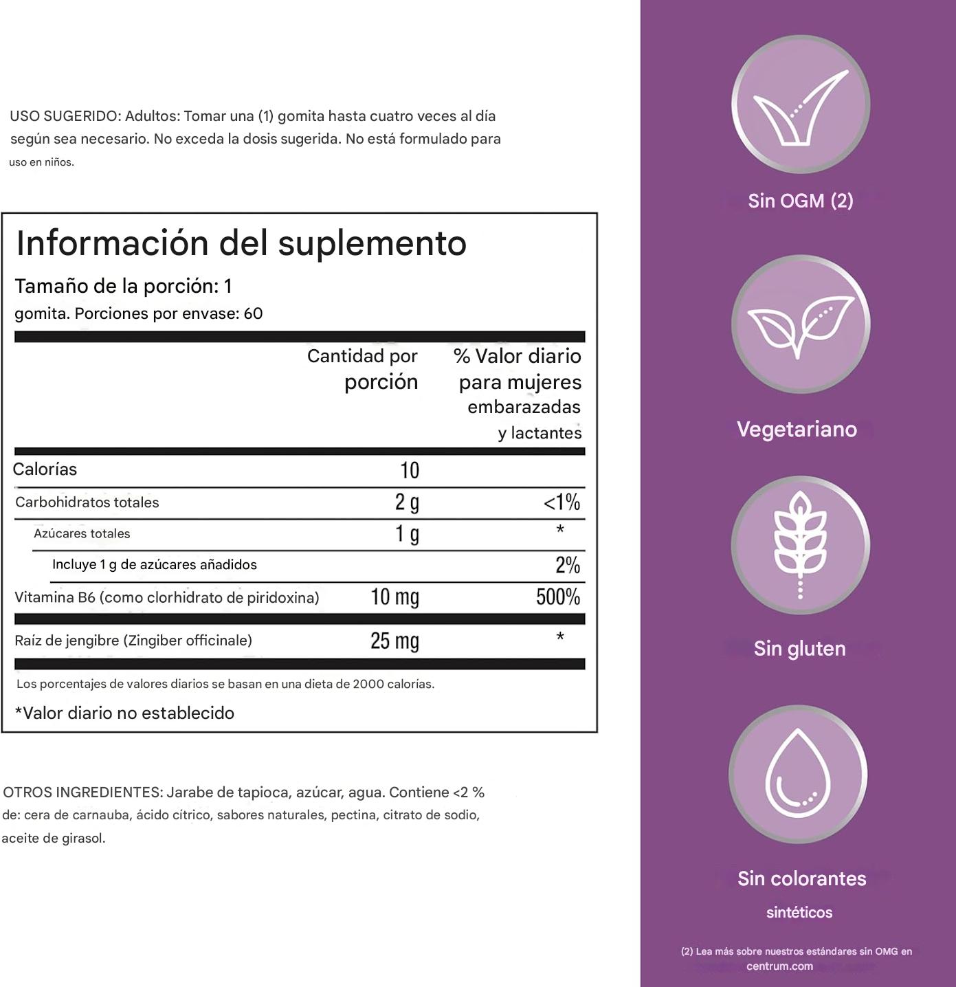 Cada una de estas gomitas Centrum ofrece ingredientes de alta calidad sin jarabe de maíz de alta fructosa, tintes sintéticos o sabores artificiales o edulcorantes. Mastica hasta cuatro gomitas diarias para ayudar a aliviar las náuseas matutinas ocasionales.