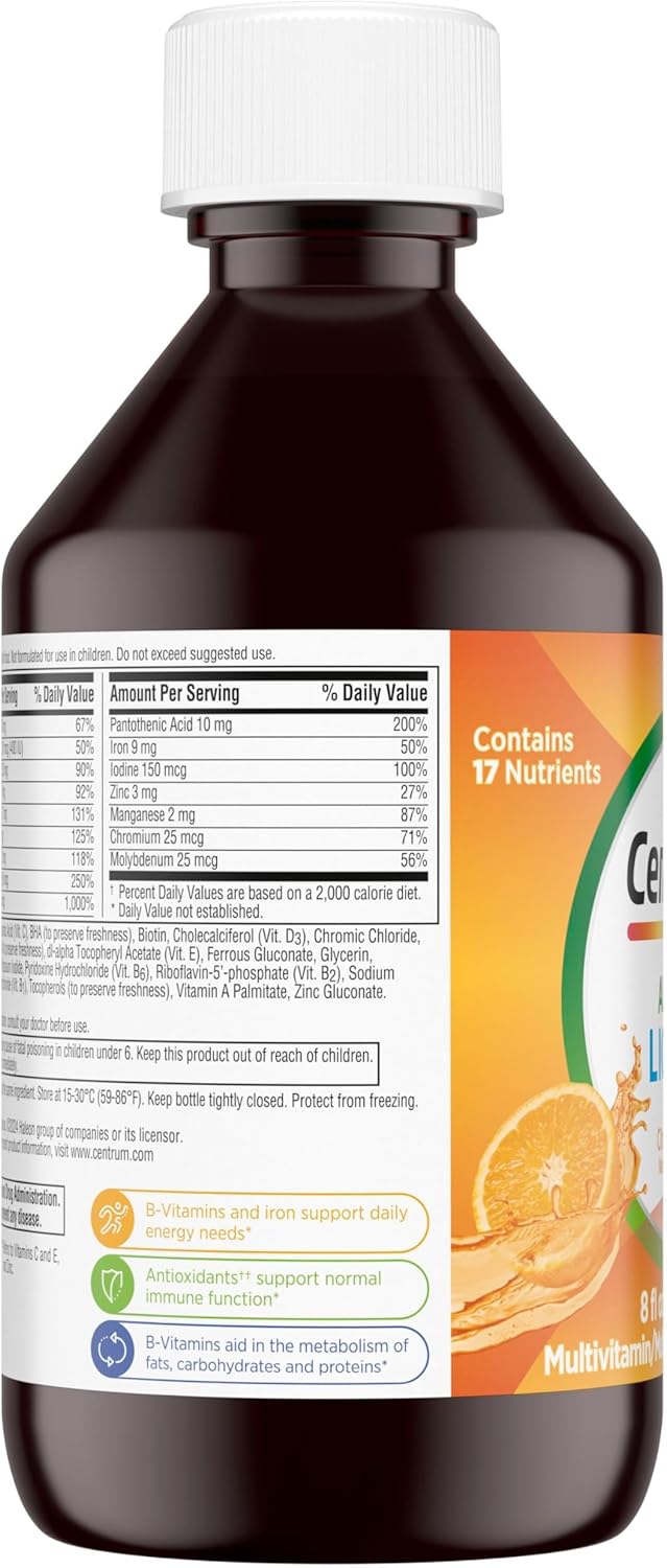 • Una botella de 8 onzas líquidas de multivitamínico líquido Centrum con sabor cítrico para adultos, suplemento multivitamínico/multimineral con vitaminas B y antioxidantes