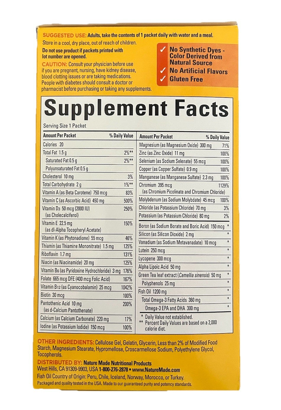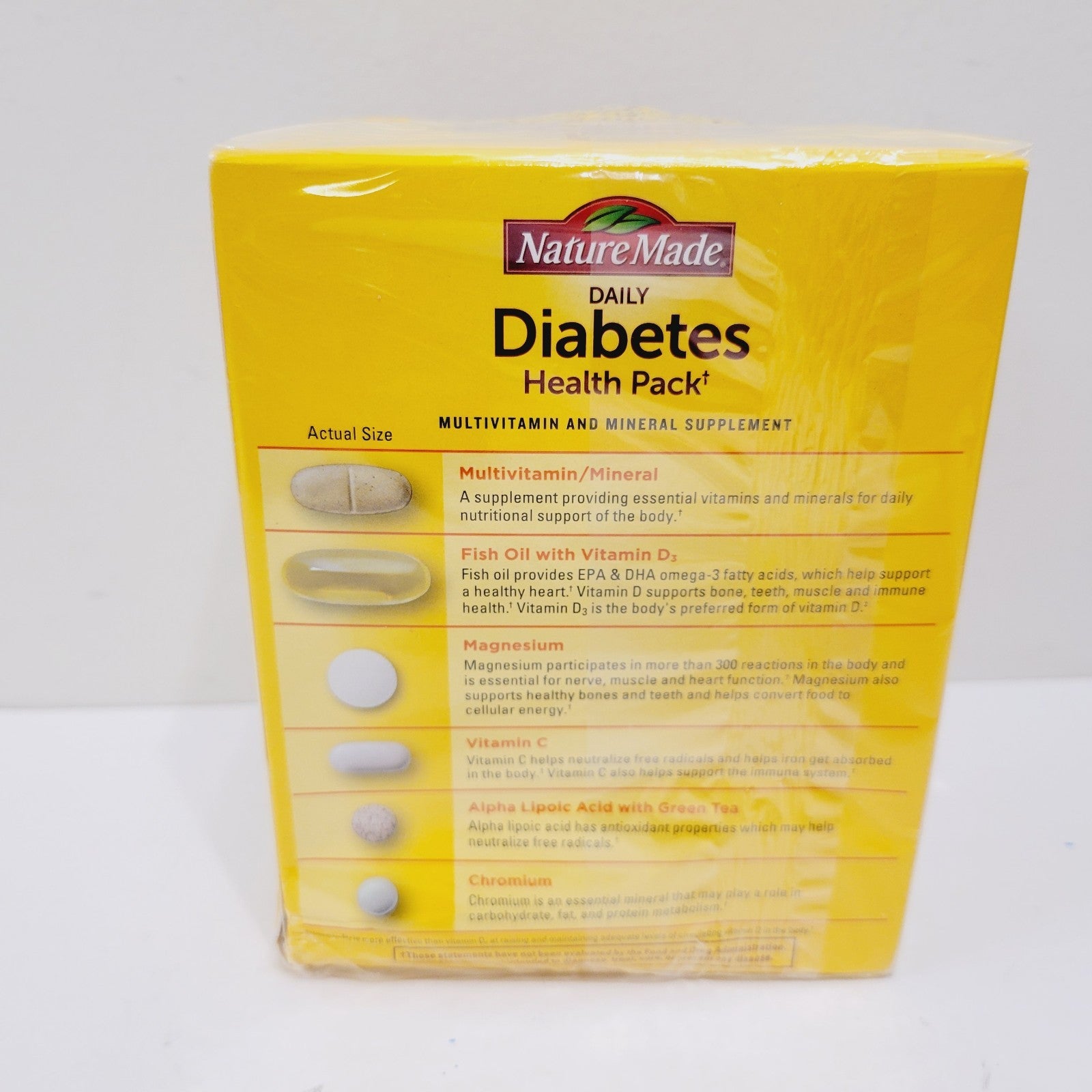 Cada paquete de suplementos nutricionales Nature Made Diabetes Health contiene una combinación completa de vitaminas clave, minerales y otros suplementos dietéticos, incluyendo un multivitamínico, aceite de pescado con vitamina D3, magnesio, vitamina C, ácido alfa lipoico y cromo.