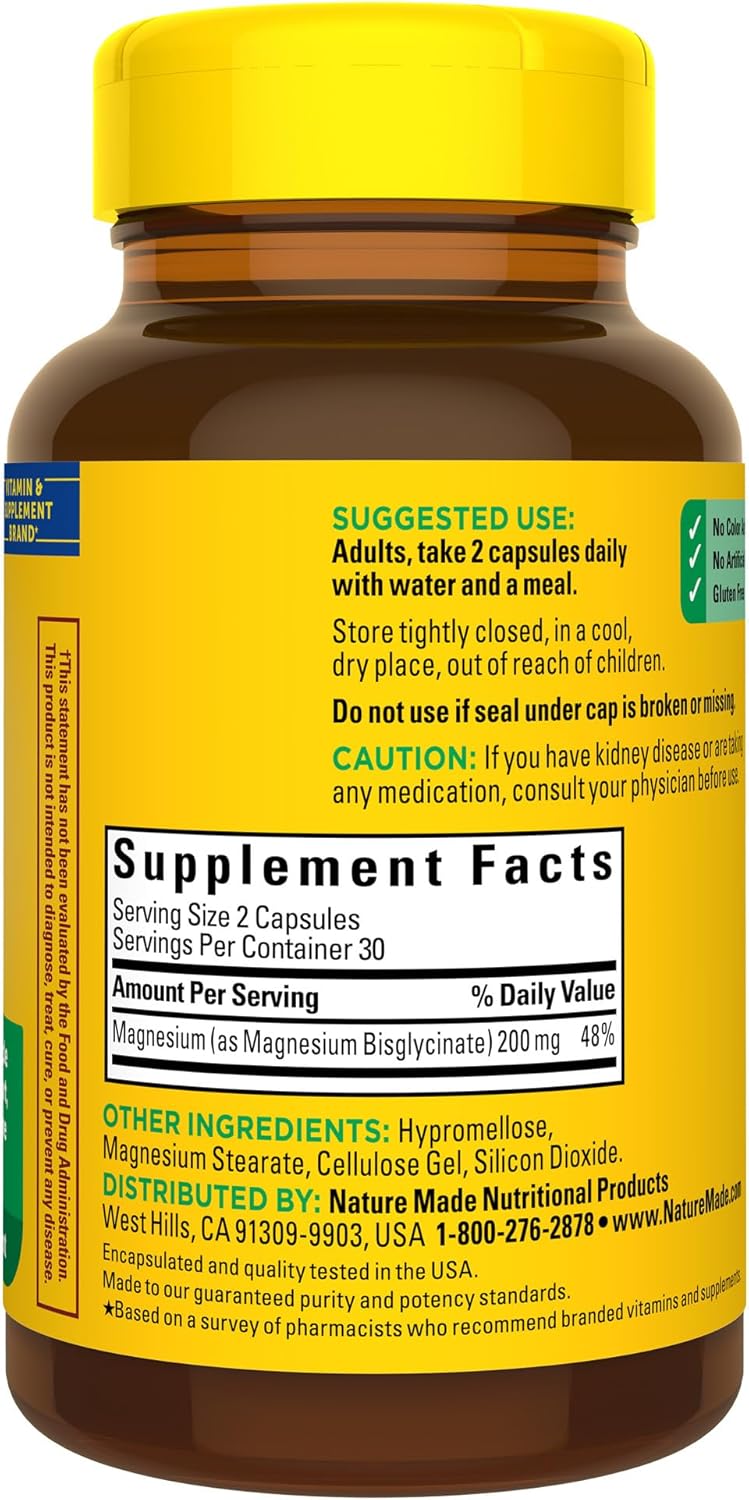 • Suplemento de apoyo para el corazón, los nervios y los huesos: contiene una botella de 60 unidades de glicinato de magnesio Nature Made 200 mg por porción cápsulas para un suministro de 30 días