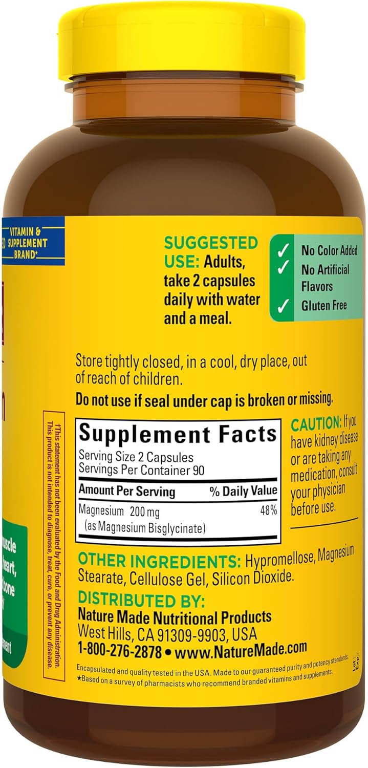 Suplemento de apoyo para el corazón, los nervios y los huesos: contiene una botella de 180 unidades de glicinato de magnesio Nature Made 200 mg por porción cápsulas para un suministro de 90 días