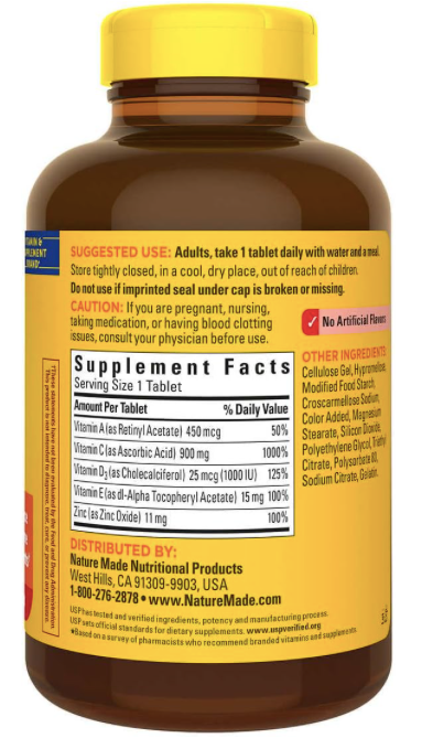 Natures Mades Super C con vitamina D3 y zinc proporciona 5 nutrientes clave de apoyo inmunológico: vitamina C (900 mg), vitamina A (450 mcg), vitamina D3 (25 mcg/1000 UI), vitamina E (15 mg) y zinc (11 mg).
