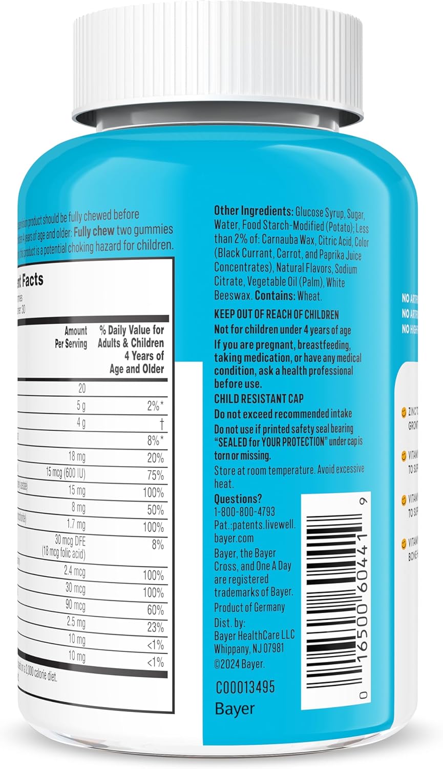• One A Day Las gomitas multivitamínicas para niños apoyan la salud general e inmunológica* para mayores de 4 años. Cada botella contiene vitaminas gomosas con sabor natural, en varios sabores de frutas: sabor natural a naranja, frambuesa y cereza. (El embalaje puede variar)