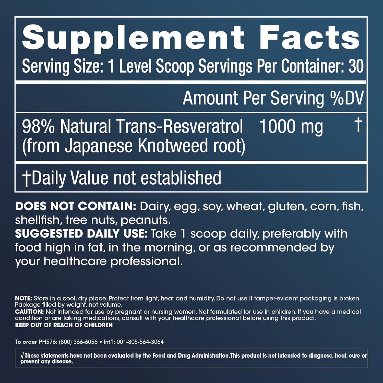 • Forma biológicamente activa de resveratrol - El resveratrol regular se compone de 50% de trans-resveratrol y 50% cis-resveratrol; la investigación sugiere que solo la forma trans-forma tiene una actividad biológica valiosa. El polvo de trans-resveratrol micronizado de ProHealth ofrece 1000 mg de trans-resveratrol natural puro de grado farmacéutico, 98% puro por porción.