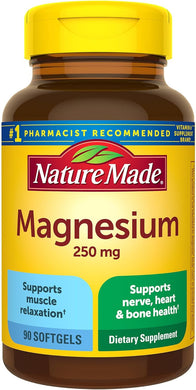Nature Made Magnesio 250 mg, suplemento dietético para apoyo muscular, corazón, ln25 hueso y nervioso, 90 cápsulas blandas, suministro para 90 días