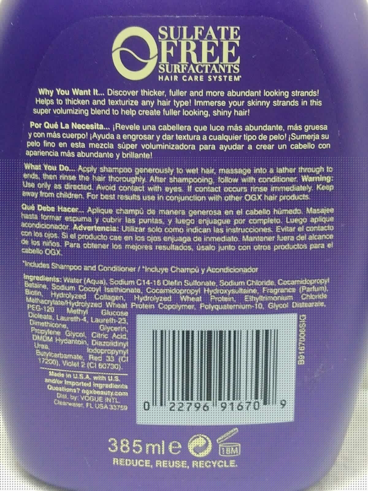El champú OGX Extra Strength Biotin & Collagen es un potente generador de volumen con una dosis extra de vitaminas y proteínas para darle volumen a las hebras planas. Un cuerpo extra no significa un peso extra con una mezcla espesante de surfactantes sin sulfatos con ingredientes nutritivos para un cabello voluminoso y abundante. La biotina, o vitamina B7, es crucial para la salud de la piel, las uñas y el cabello.