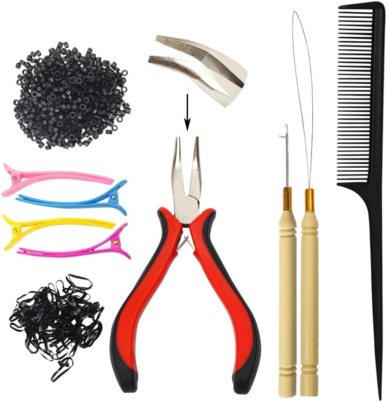 - Recibirás 1500 microanillos de silicona en 3 colores (negro, rubio y marrón), 1 aguja de gancho, 1 aguja de tracción, 1 alicates de punta I, 4 clips de colores aleatorios, 2 peines y 2 paquetes de bandas de goma negras
