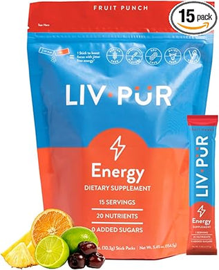 Suplemento energético en polvo | Favorece la concentración y la claridad mental | Cafeína natural de absorción lenta | Energía sin nerviosismo | Vitaminas B12 y C | Certificado por la NSF para deportistas | Ponche de frutas, 15 barritas a22