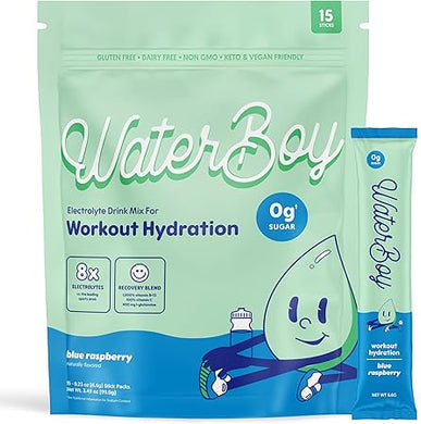 Hidratación para entrenamiento Waterboy | Sobres de electrolitos en polvo sin azúcar de 2960 mg | L-glutamina + vitaminas | Sin azúcar, totalmente natural, sin gluten | 15 mezclas para bebidas en barra (frambuesa azul) ln25