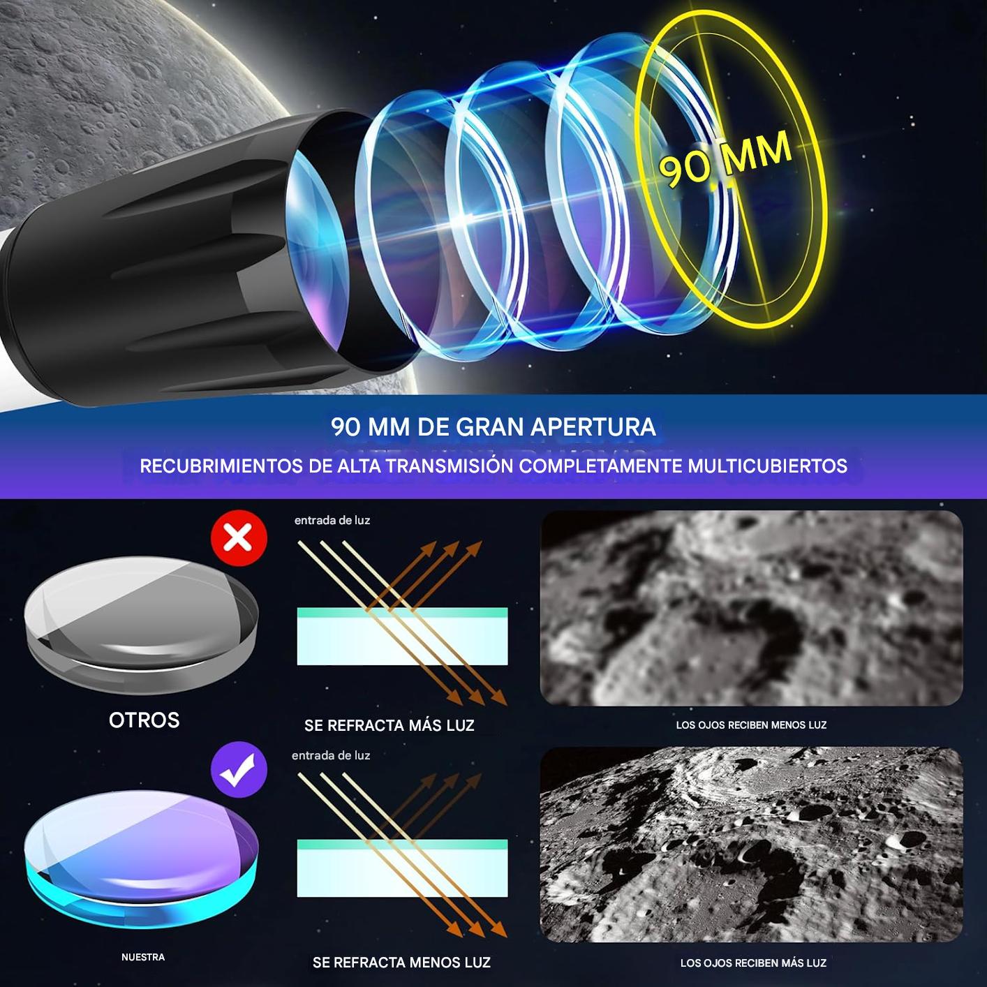• Gran apertura de 3.543 in: el telescopio astronómico tiene una distancia focal de 31.496 in (f/8.88) y una apertura de 3.543 in. La apertura de 3.543 in captura más imágenes claras, las lentes de vidrio óptico totalmente multicapa con revestimiento de alta transmisión mejoran el brillo y la claridad de la imagen