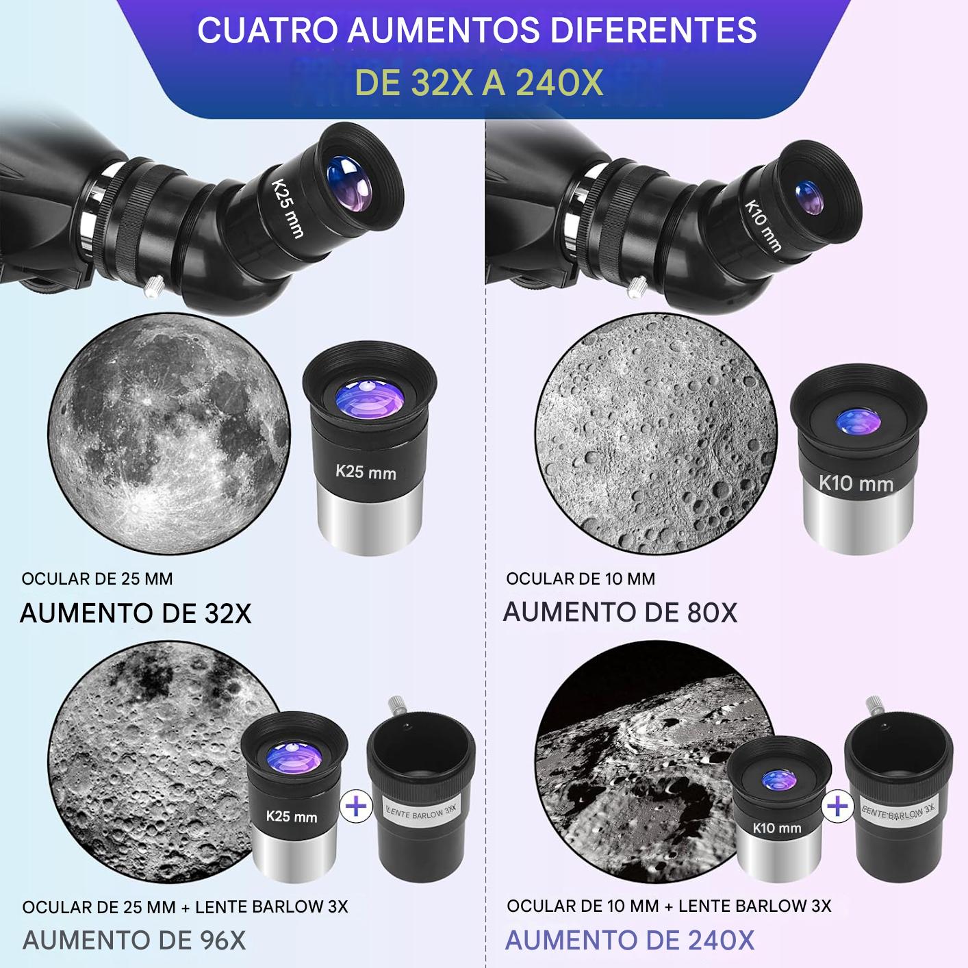 • Ampliación óptima (32X-240X): Nuestro telescopio para adultos de alta potencia está equipado con dos oculares (0.394 in y 0.984 in) y una lente Barlow 3X. La lente 3X Barlow triplica el aumento de cada ocular, lo que nos permite observar detalles lunares sin precedentes