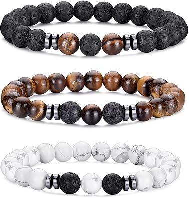 - uego de pulseras de cuentas para hombre: este juego de pulseras de cuentas se compone de 3 pulseras diferentes para hombre, incluyendo pulsera de ojo de tigre, pulsera blanca, pulsera de roca volcánica negra, cuentas de piedra natural que poseen baja densidad y peso ligero. Su sensación fresca en las manos puede hacer que la ansiedad se calma.
