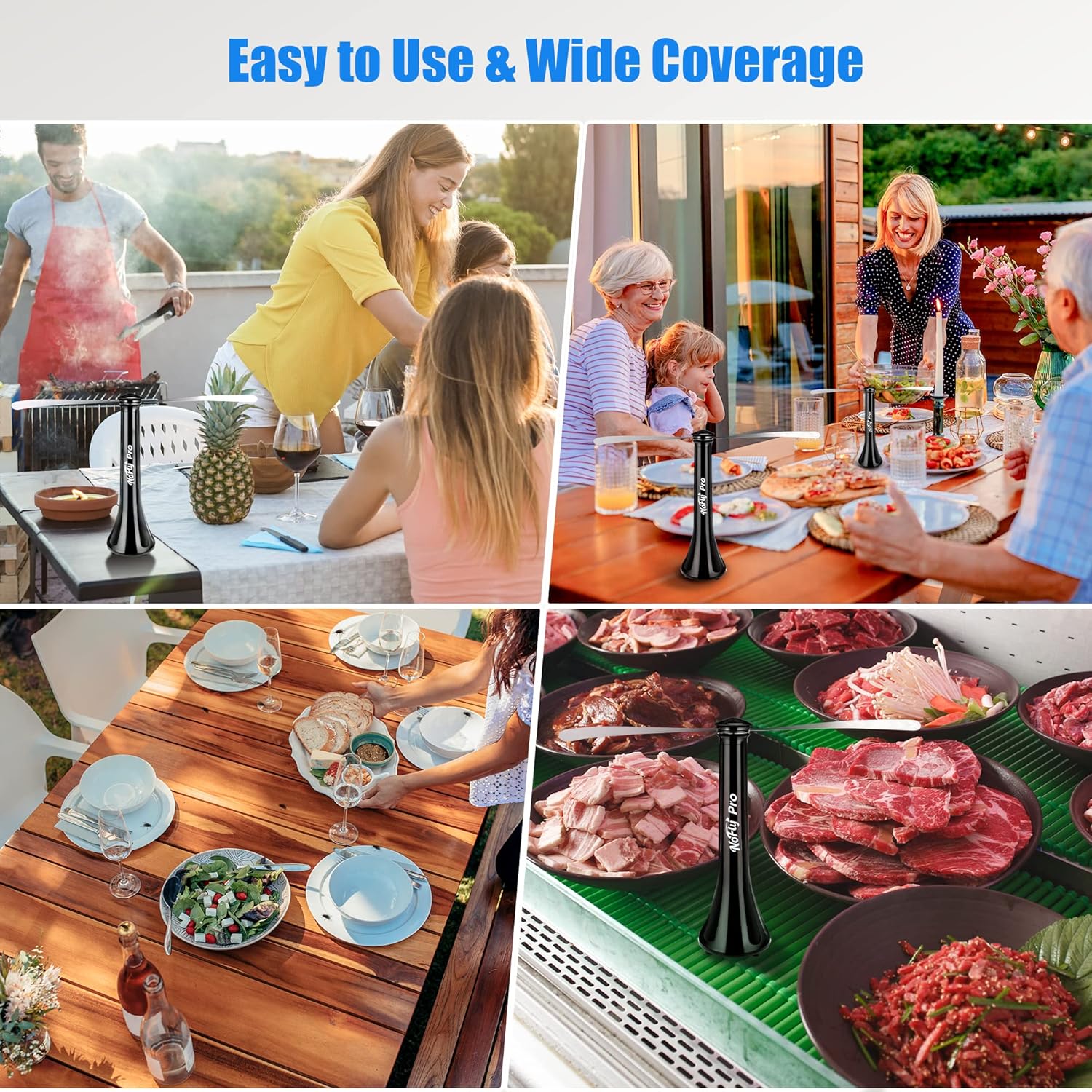- Ventilador de mesa repelente de moscas: los ventiladores de protección sin químicos para mesas utilizan solo métodos físicos para proteger tus alimentos y bebidas de las moscas. Las cuchillas giratorias crean una fuerte brisa que interrumpe el vuelo de la mosca, mientras que las superficies reflectantes desorientan a los insectos, no se necesitan productos químicos. No más plagas que matan; disfruta de comidas frescas y tiempo de calidad con amigos.
