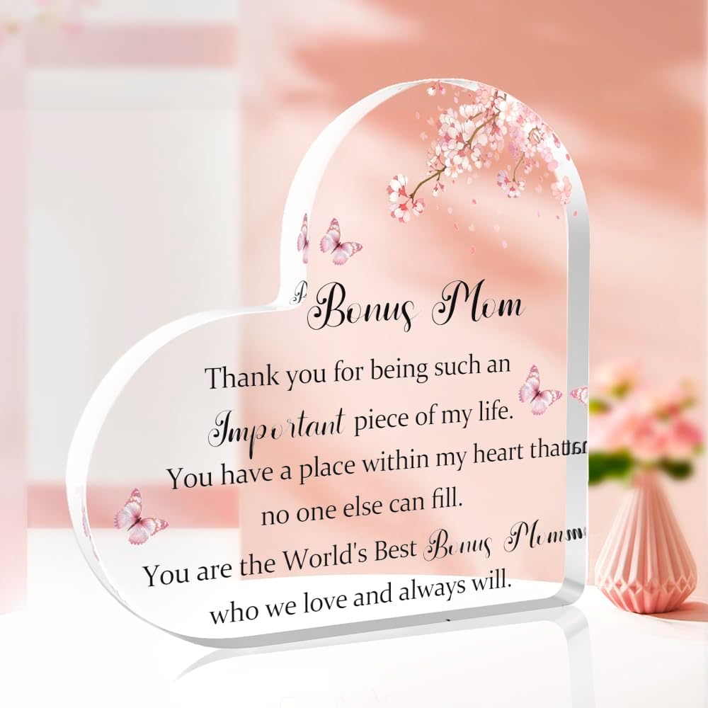 - Regalos en acrílico: Con un diseño en forma de corazón, un diseño único y exquisito, el patrón no se desvanece fácilmente. Impreso con palabras cálidas - Bonus mamá, gracias por ser una pieza tan importante en mi vida. Tienes un lugar en mi corazón que nadie más puede ocupar. Eres la mejor mamá extra del mundo, a la que queremos y siempre querremos. Ya sea un cumpleaños, un aniversario, una fiesta o un agradecimiento, este es un regalo inolvidable.